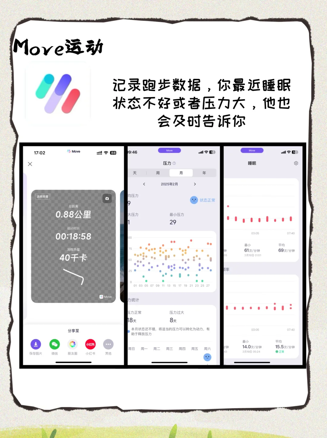 Move运动:运动时开着能记录距离、时长和消耗的卡路里,数据看得清清楚楚。还能看自己的压力和睡眠情况,减肥的时候也能顾着身体状态,让身体不会出问题。
