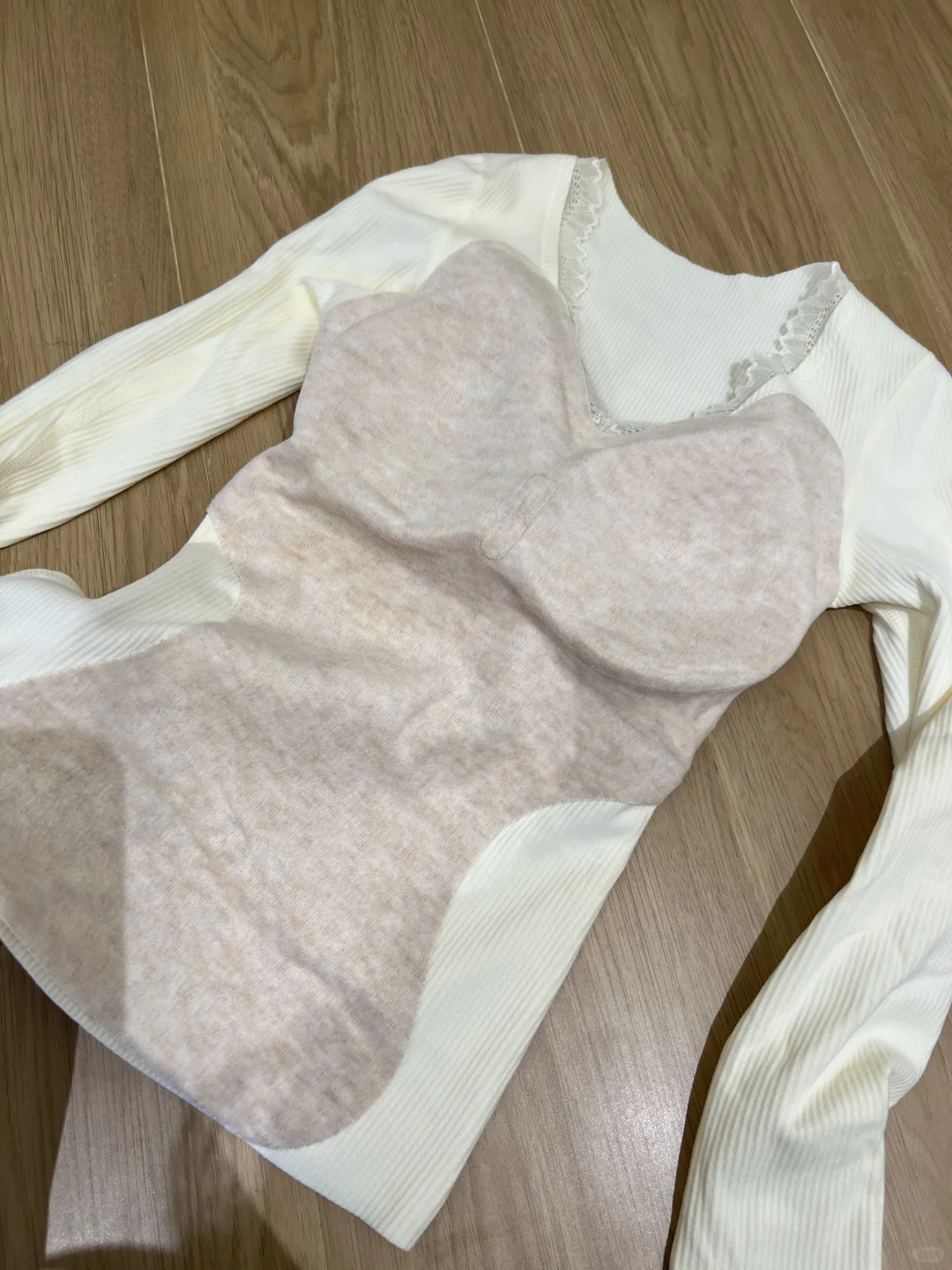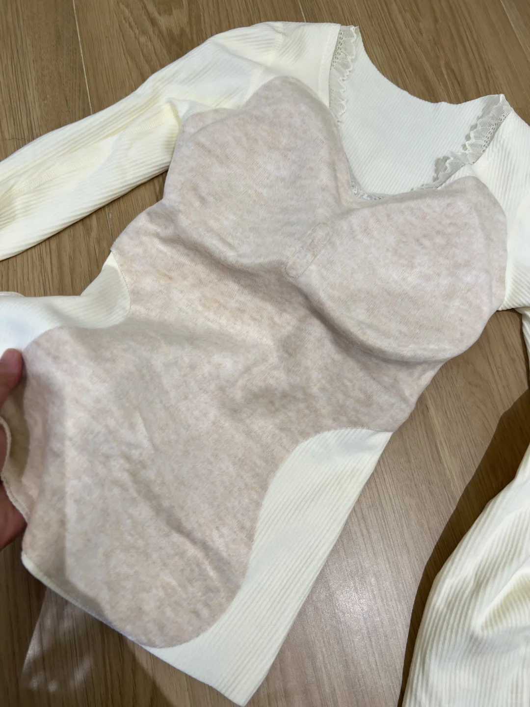 自带胸垫,服帖胸部,不空杯不跑杯!小胸直接拿捏胸大腰细感!长袖版的保暖衣真的一件入冬!不冷不勒!胸前加了一片羊绒糯叽叽的很舒服!