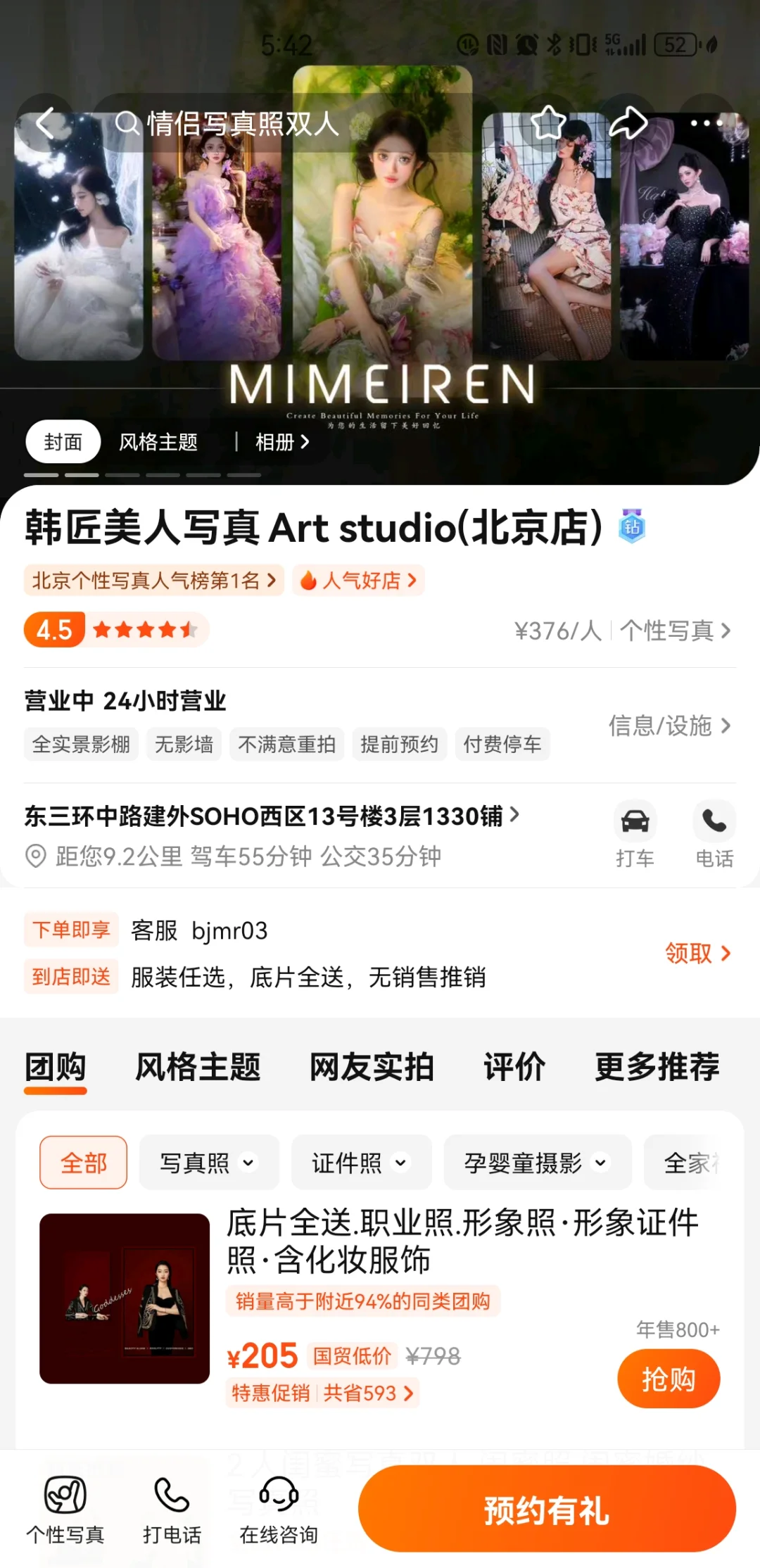 ①工作日去的,上午十点半到的,三套衣服+选完片拍完都下午五点半了,但是实际妆造拍摄时间满打满算也就俩小时,其他时间都在排队等。