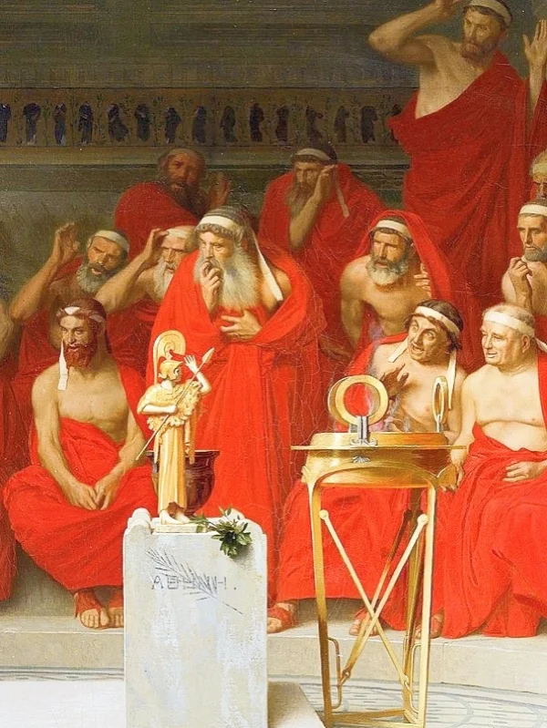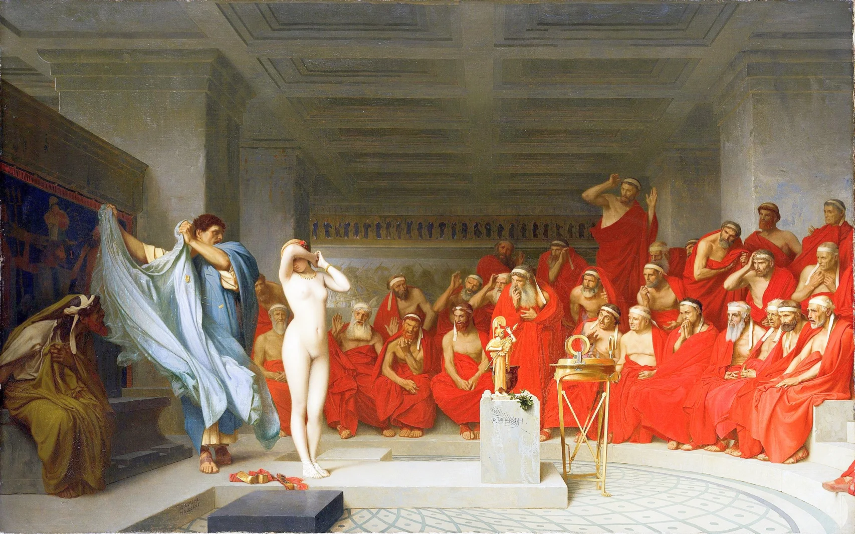 众人无法接受这样的阿佛洛狄忒,于是控告芙丽涅亵渎神明,这幅画描绘的就是芙丽涅在法庭上的画面。