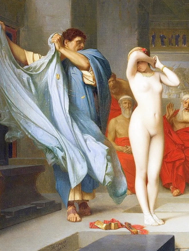 瞠目结舌的法官最终法庭判决芙丽涅无罪,法国画家热罗姆由此于1861年创作了这幅画。