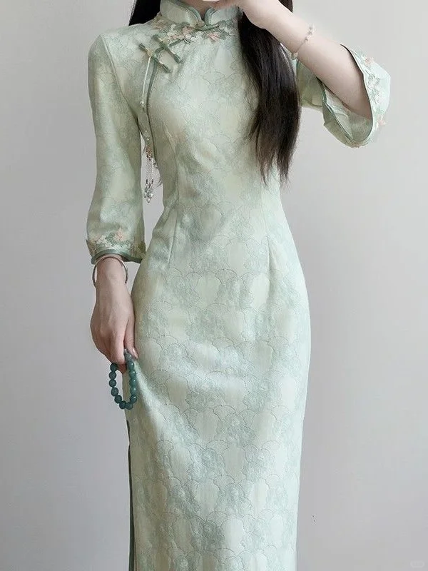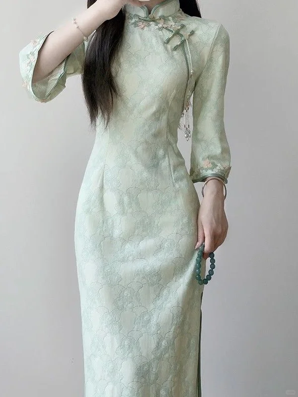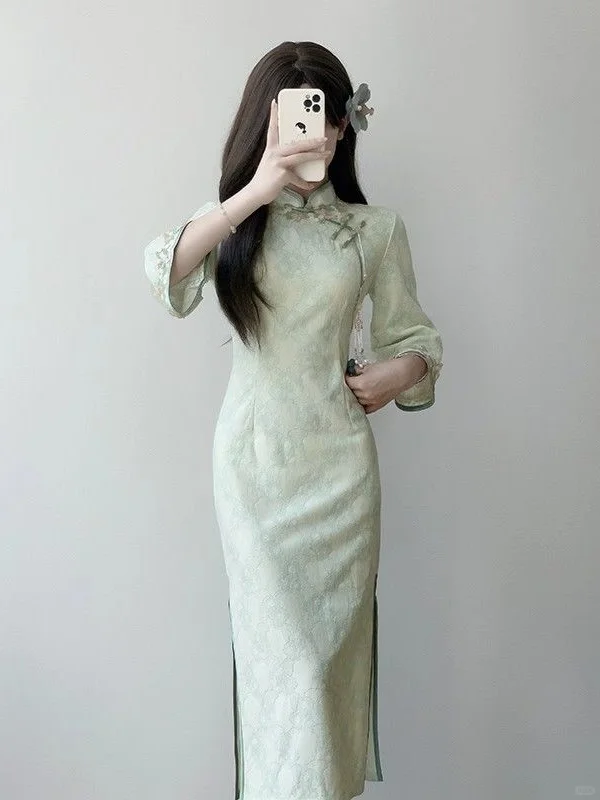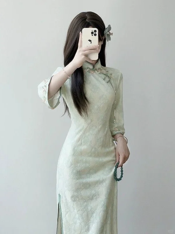 “旗袍是行走的水墨,青春是未完的诗。”这一抹清新绿提花旗袍,搭配灵动的 倒大袖设计,既有江南少女的温婉,又藏着一丝俏皮元气,上学逛街都能轻松驾驭!