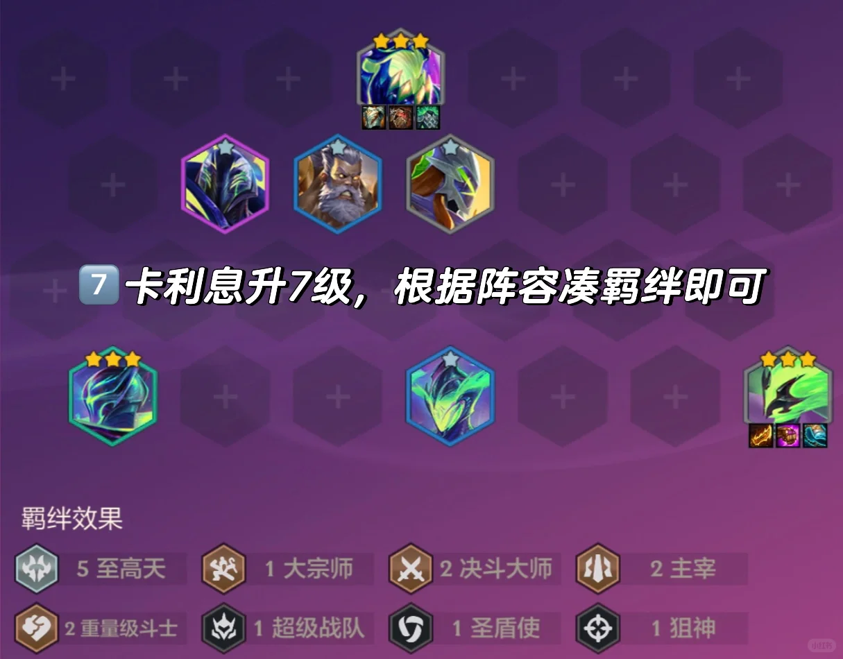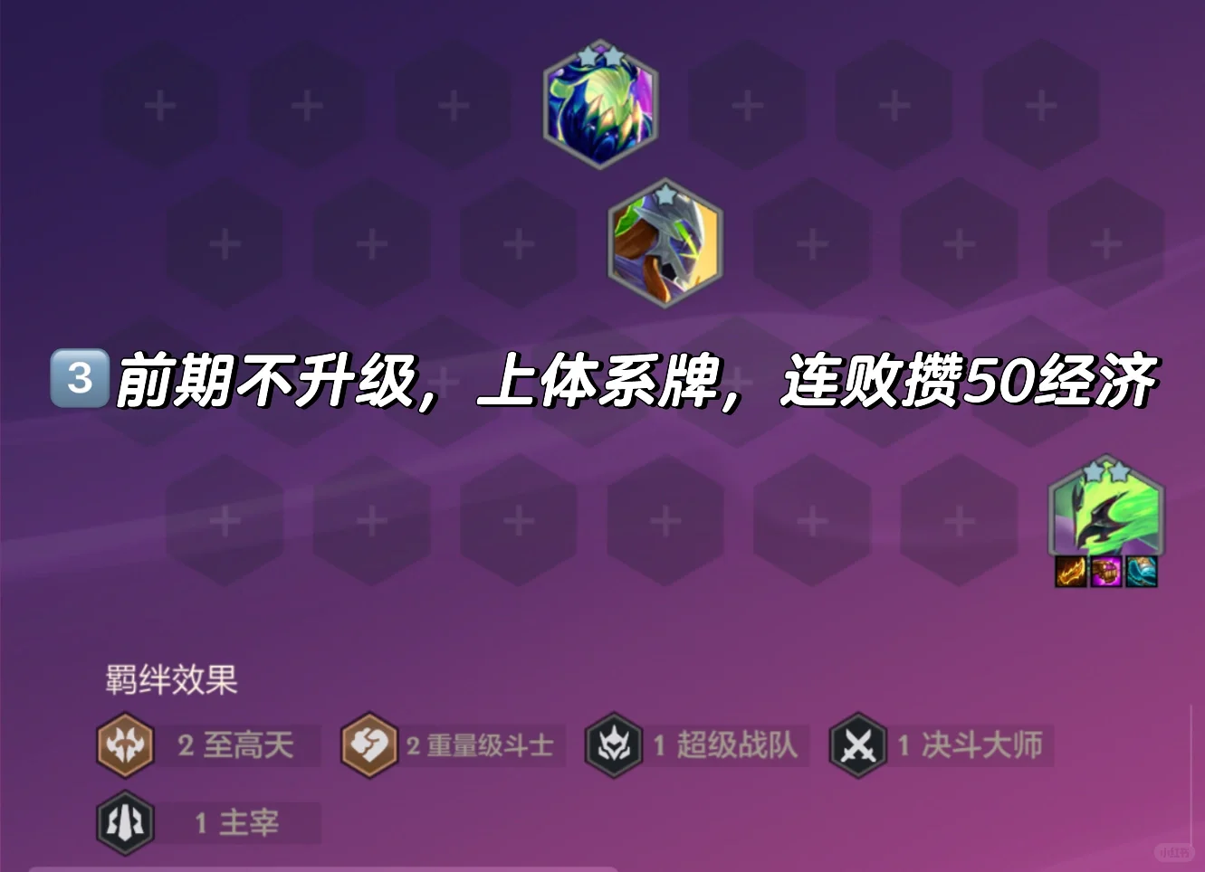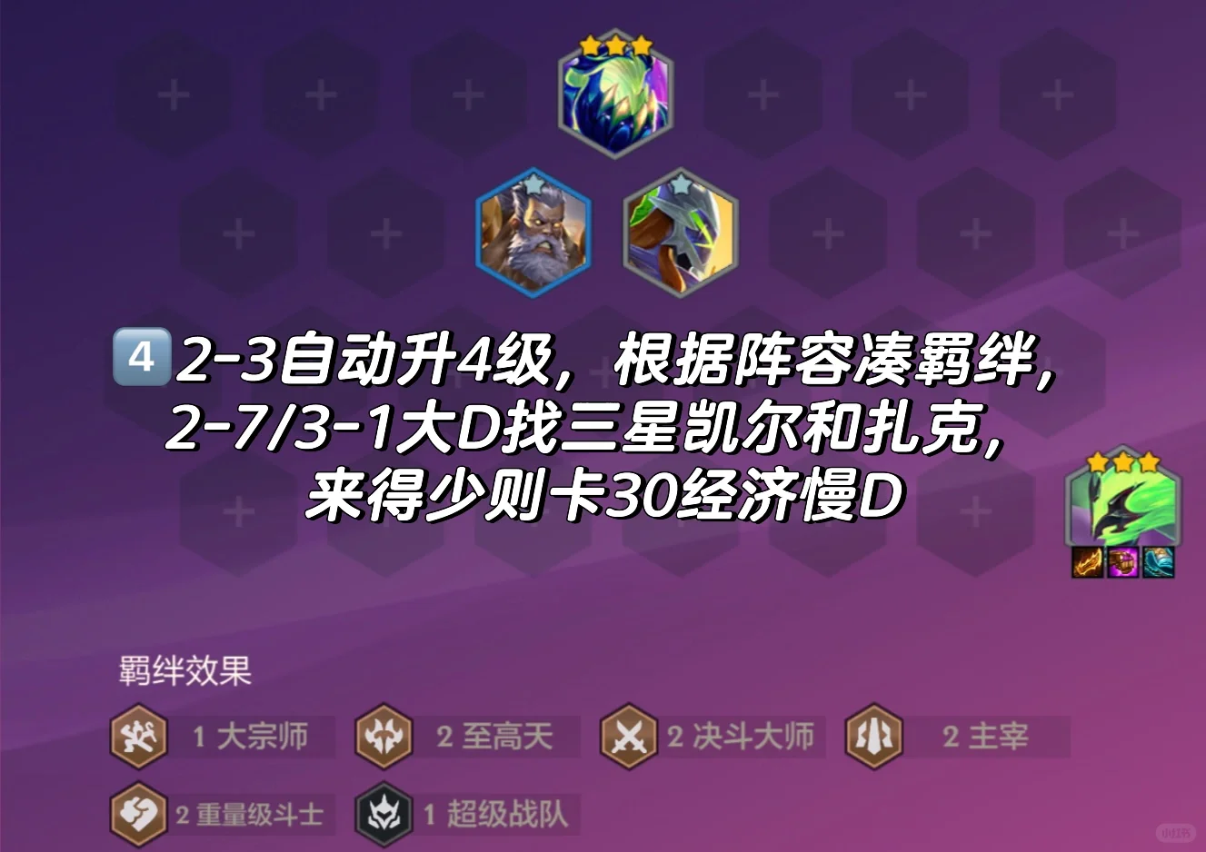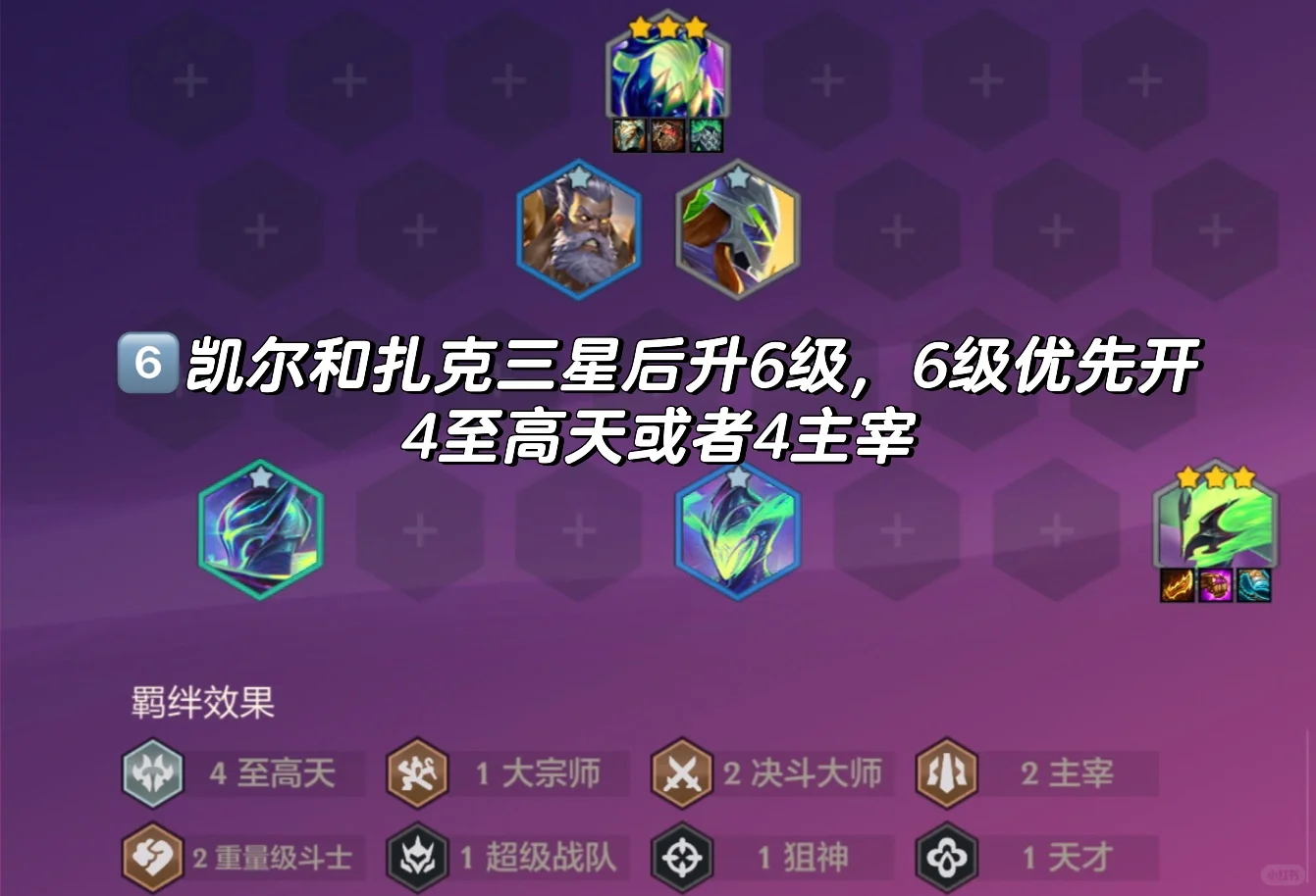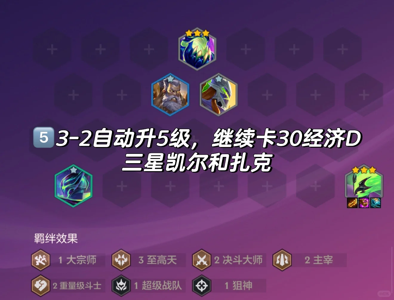 3️⃣前期不升级,上体系牌,连败攒50经济;4️⃣2-3自动升4级,根据阵容凑羁绊,2-7/3-1大D找三星凯尔和扎克,来得少则卡30经济慢D;5️⃣3-2自动升5级,继续卡30经济D三星凯尔和扎克;6️⃣凯尔和扎克三星后升6级,6级优先开4至高天或者4主宰;7️⃣卡利息升7级,根据阵容凑羁绊即可;8️⃣继续卡利息升8级,优先开6至高天,韦鲁斯没来先上金克丝;9️⃣后期经济足够直接升9级,找二星韦鲁斯和婕拉即可