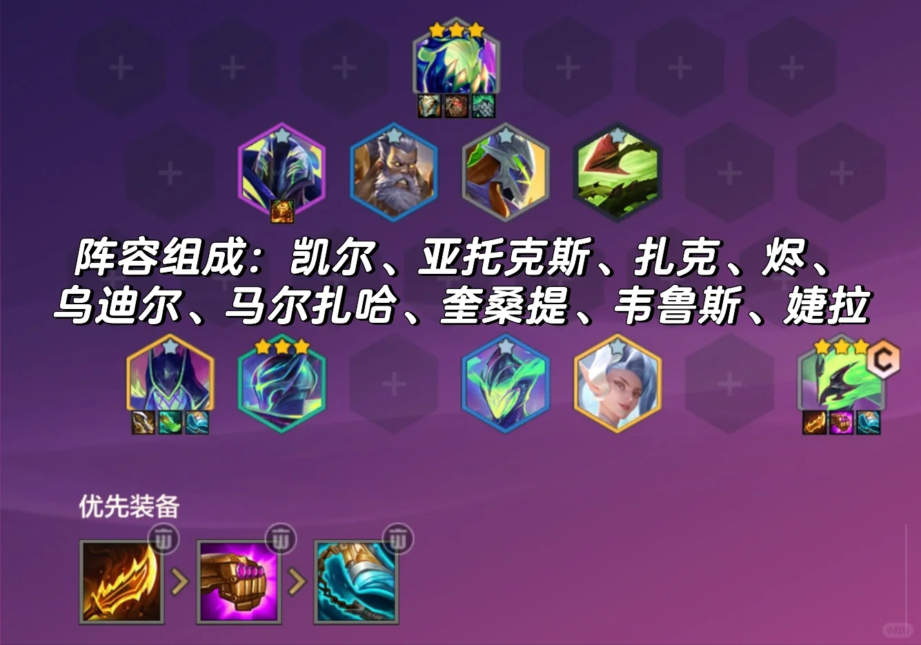 阵容组成:凯尔、亚托克斯、扎克、烬、乌迪尔、马尔扎哈、奎桑提、韦鲁斯、婕拉