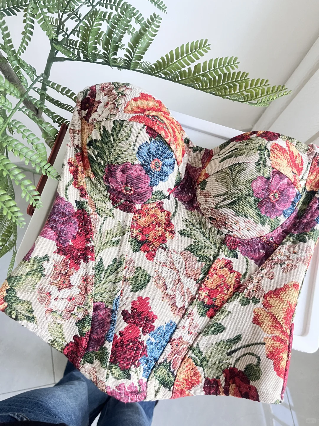 • 外面叠穿这件印花胸衣,复古花色瞬间点亮整体造型