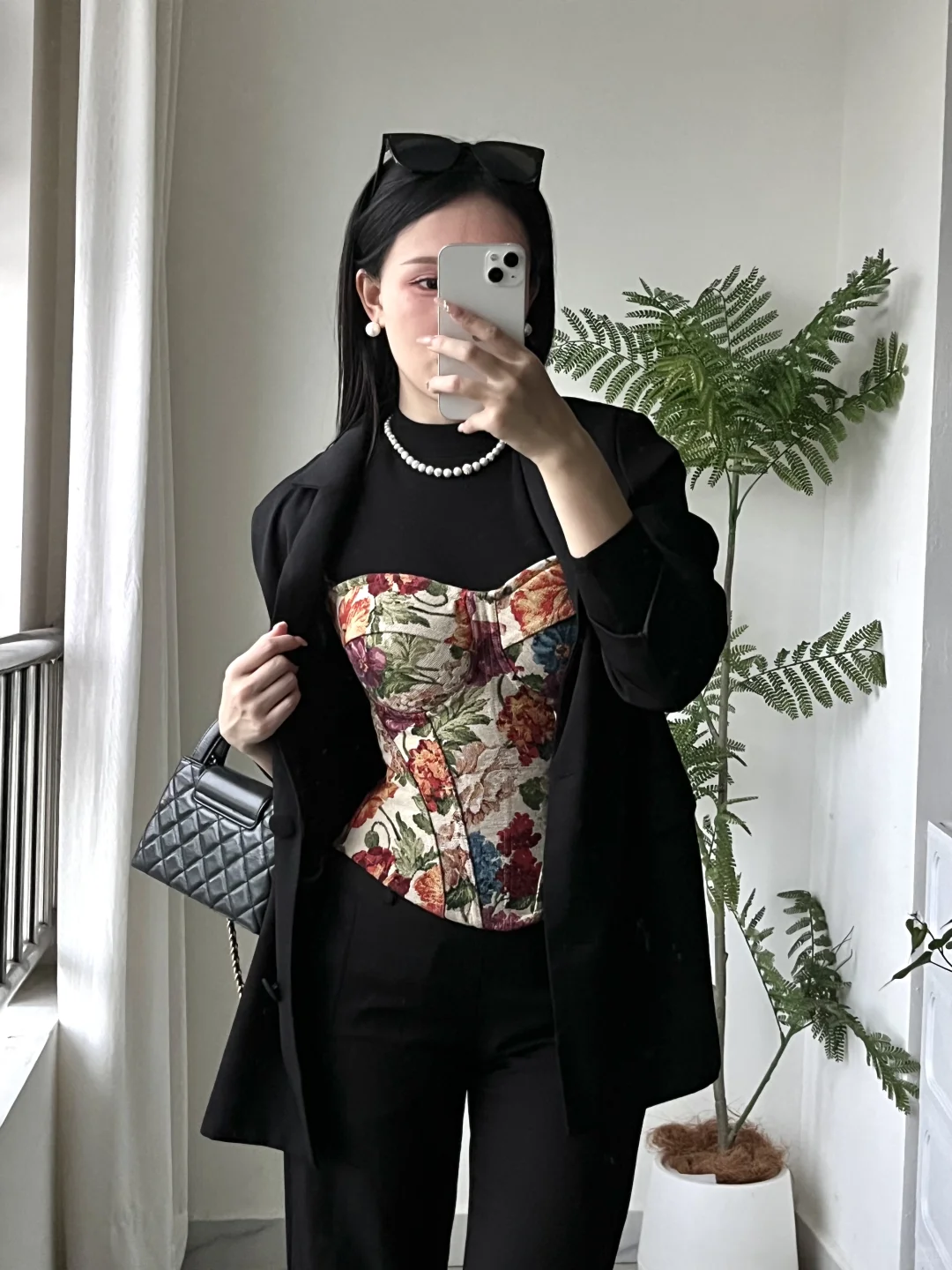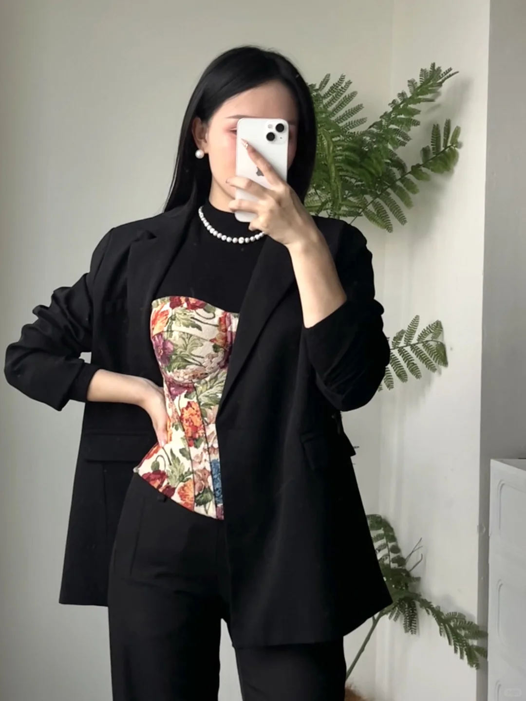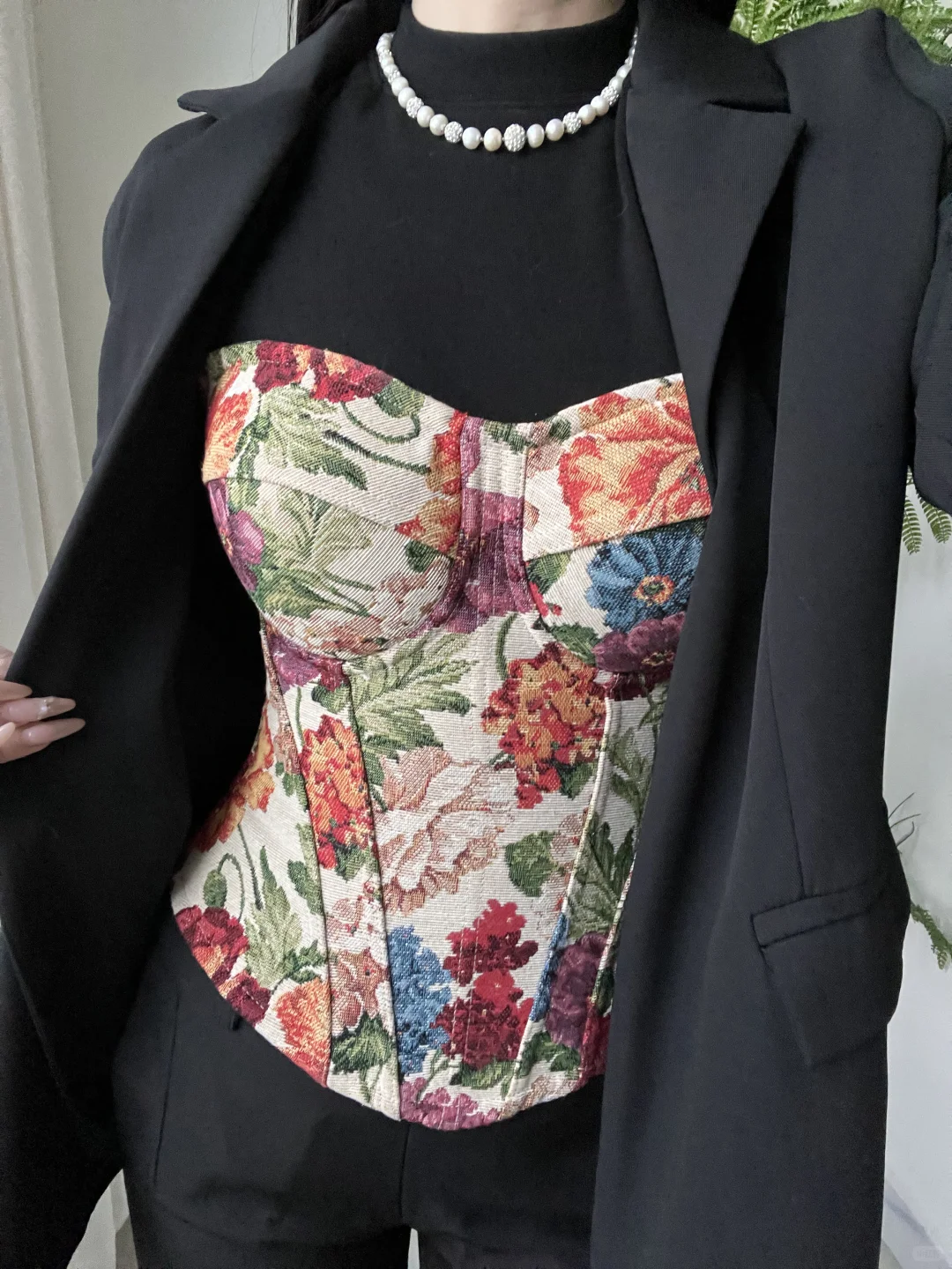 最近挖到的复古花卉胸衣,本来以为只能单穿,没想到叠穿在西装里,好好看✨