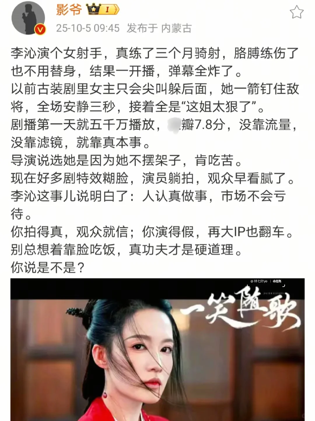 近期看的《一笑随歌》中,她饰演的付一笑兼具江湖侠女的飒爽与市井少女的鲜活,打戏干脆利落,情感戏细腻动人,完 美驾驭“甜而不腻、飒而不冷”的人设。谁懂,继《锦绣南歌》时隔五年后,再次看到李沁的打戏,狠狠吻上。