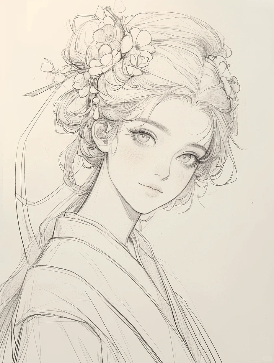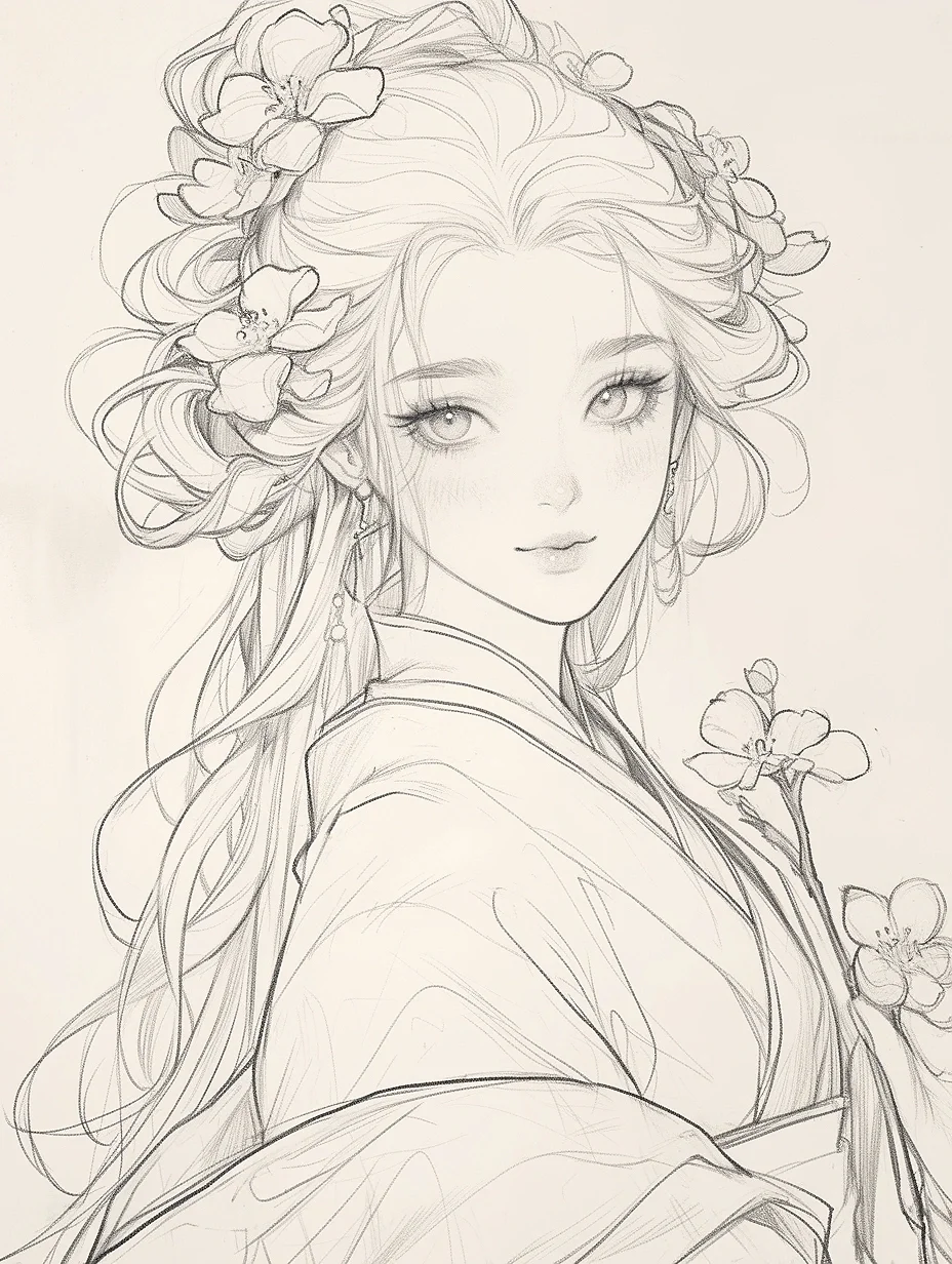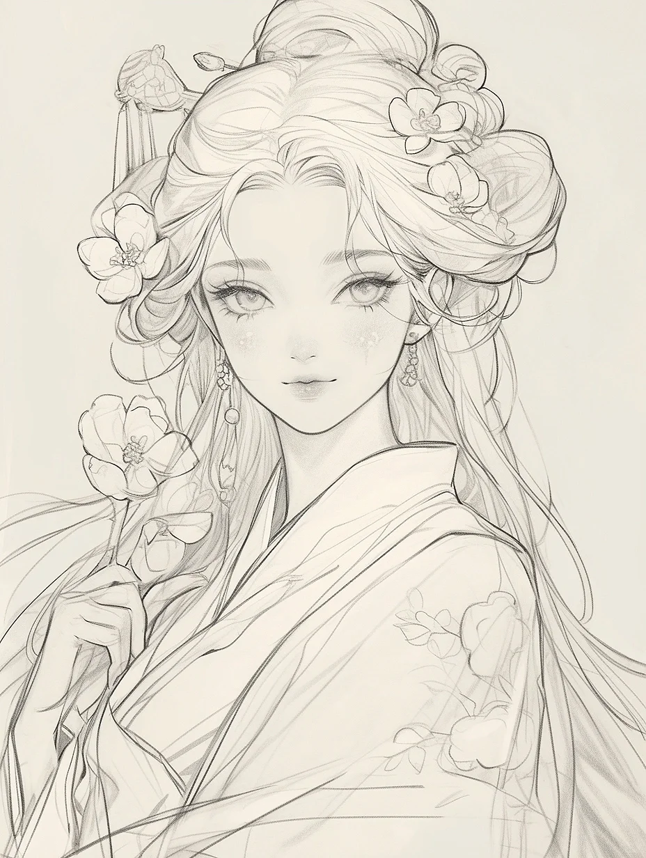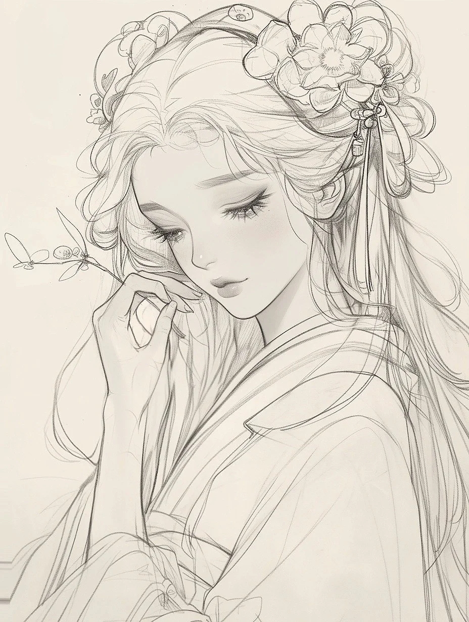 花神少女|古风素描线稿人物插画素材|A120