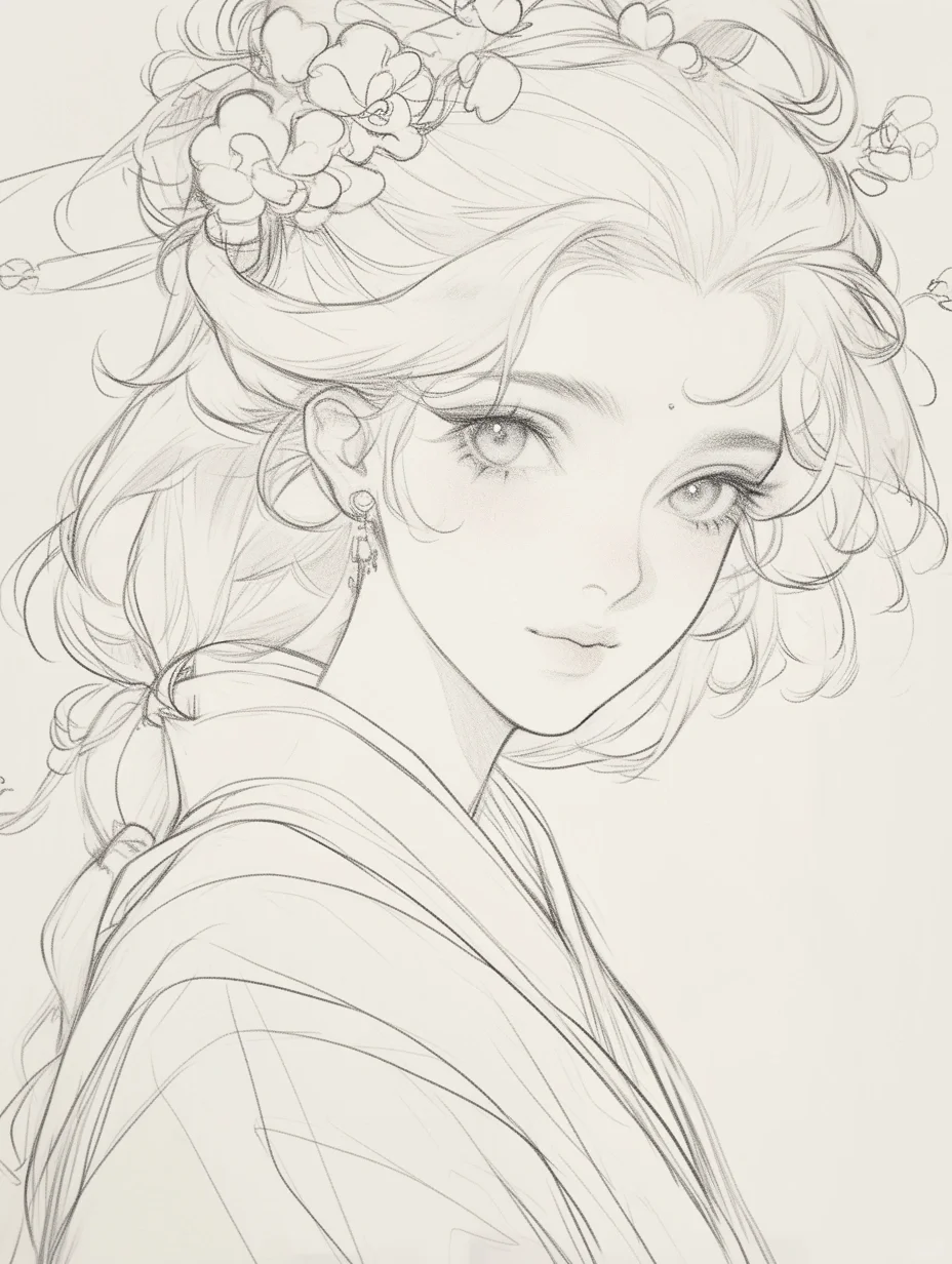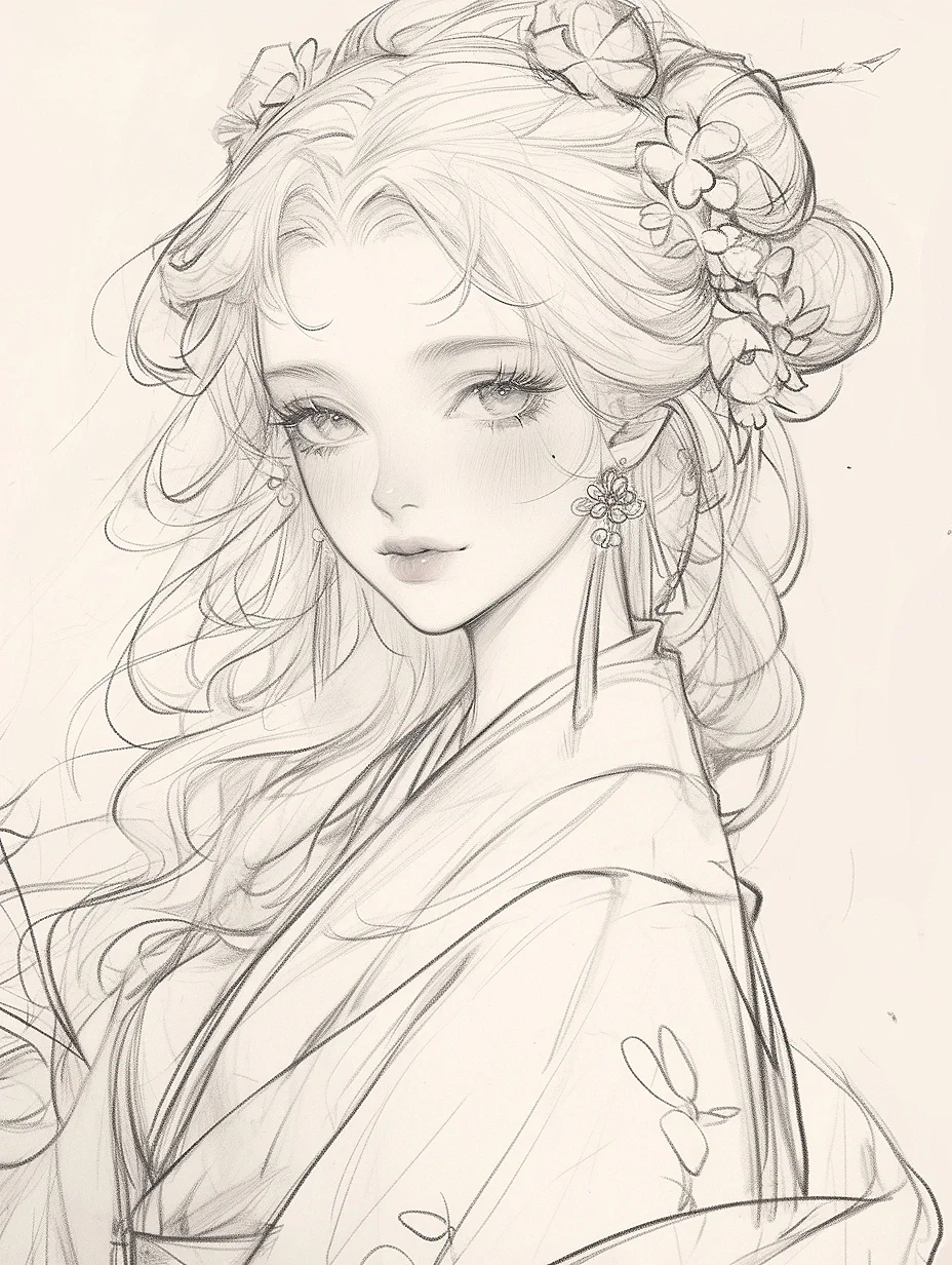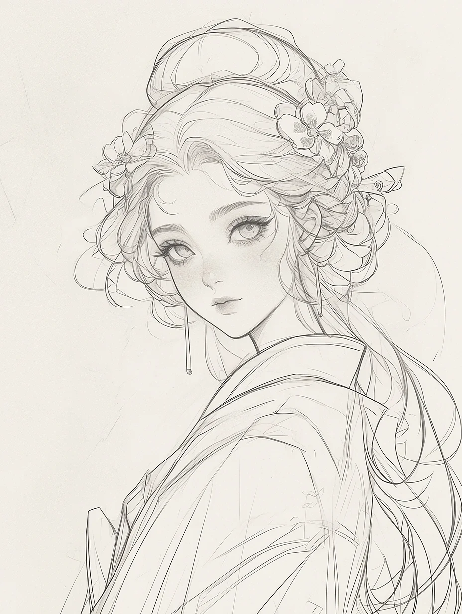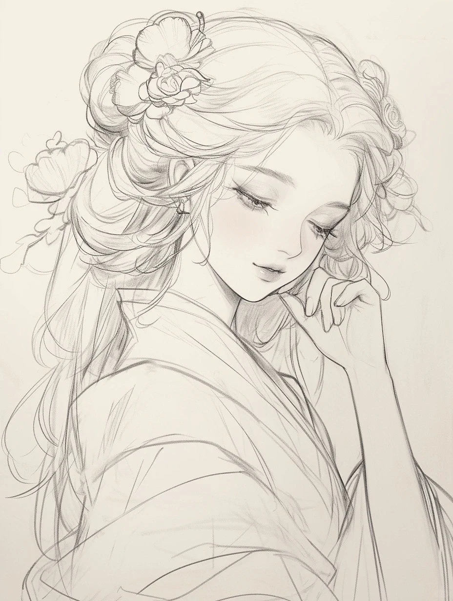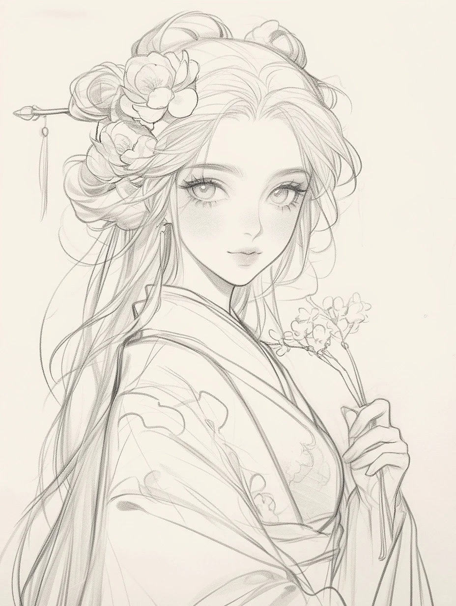 花神少女|古风素描线稿人物插画素材|A120