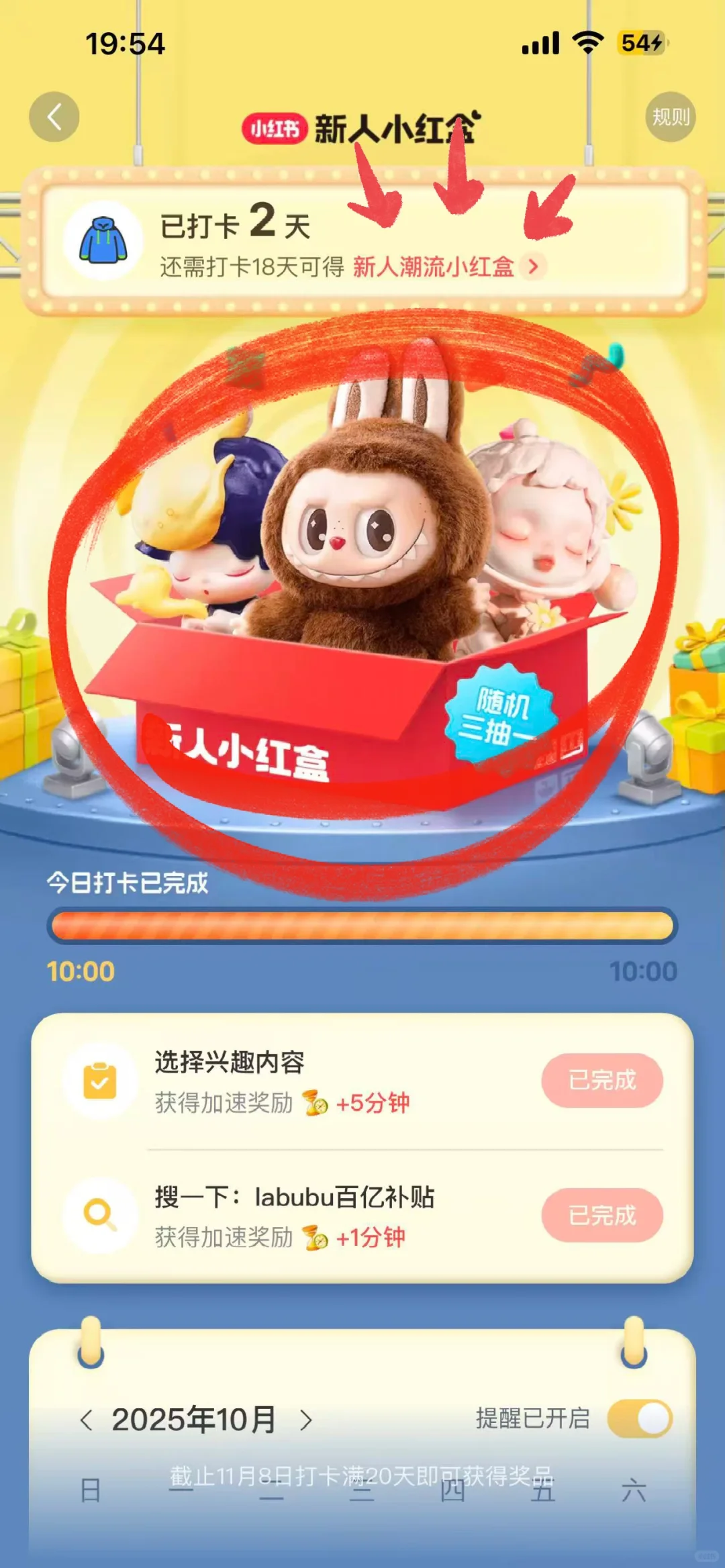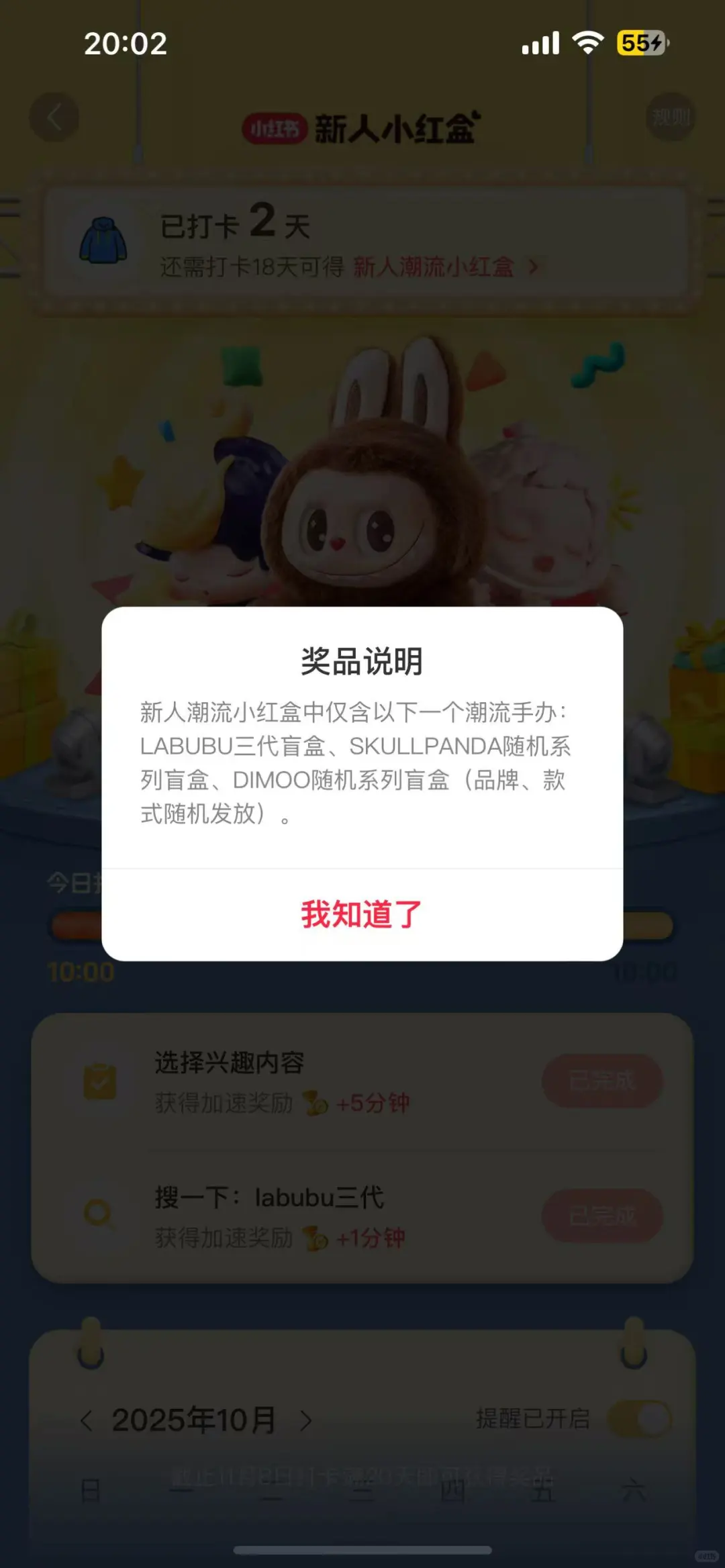 偶然发现小红书app上有一个新人活动,成功打卡可以拿到奖品,有labubu三代、skullpanda和dimoo随机盲盒,有没有小伙伴成功打卡,最后拿到盲盒的啊?