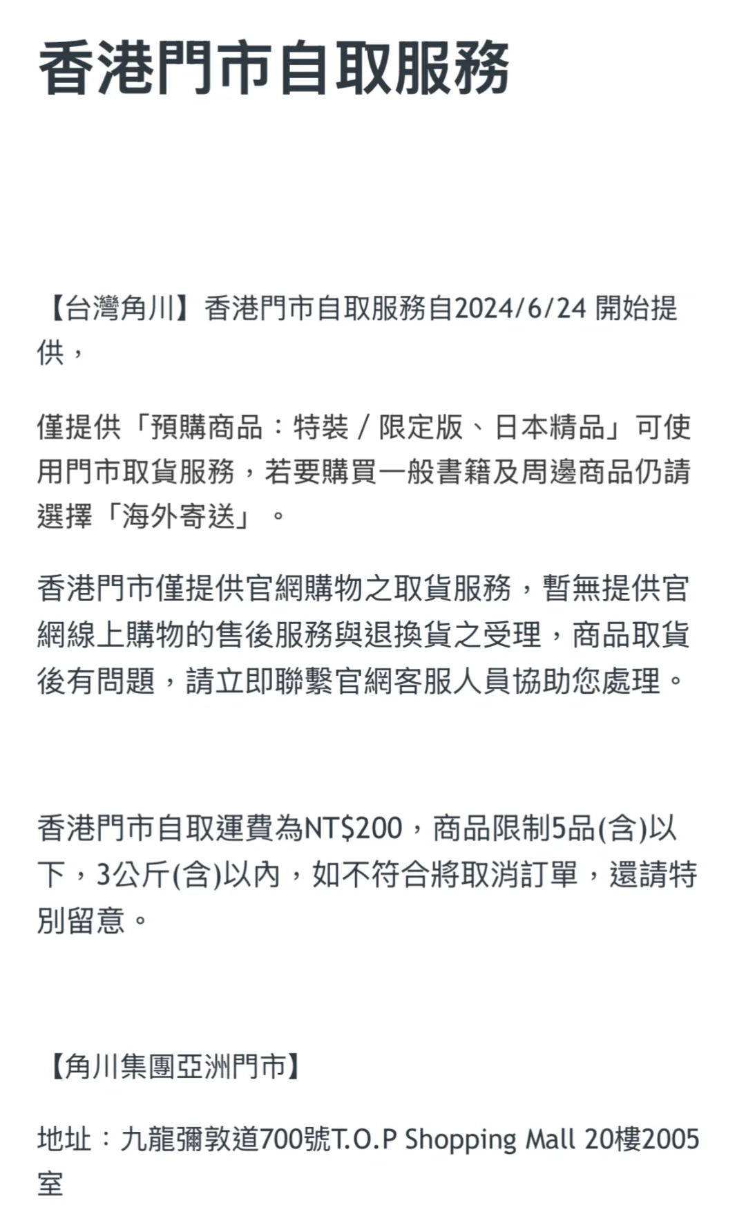 不敢加tag怕帖子吞了,感觉应该能推流给需要的姐妹们。看到好多同担不知道怎么去买书,其实有个门市自提的方法大家都没有留意到。因为这次发行区域是港澳台星马,应该是版权协议只给到这个范围,有个最简单的办法就是香港门市自提。购买时留好取货人真实姓名电话,地址可以随便写。这个地址只用作存档,门店自提单不会真实配送,但每单只能买五本,运费200台币(47人民币)每订单。10/16发行日一般就会到货香港门店,收到取货通知后,30天内需要在香港门店自取。这样对内地的友友们就方便许多了,也不用担心关税邮费的问题,有深广的朋友可以帮忙去香港门店代领一下就ok。角川购买页的截图放上去了,金石堂和博客来也可以类似去买,希望大家能早日到手[亲一个R] #写真集 #雷朋 #展丞