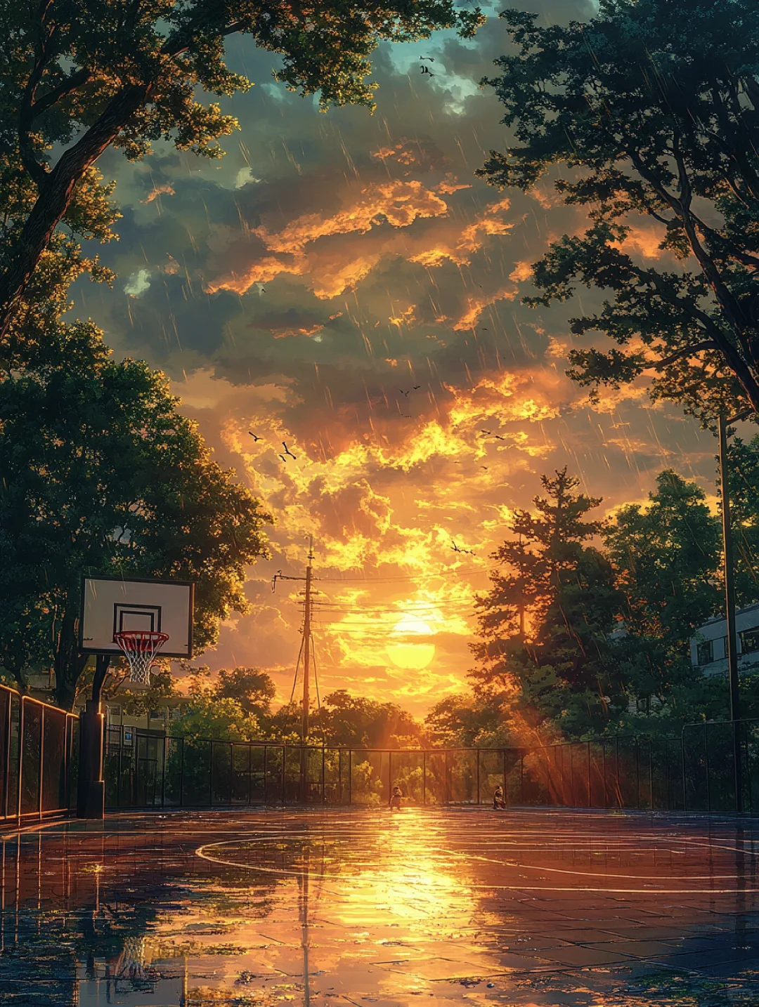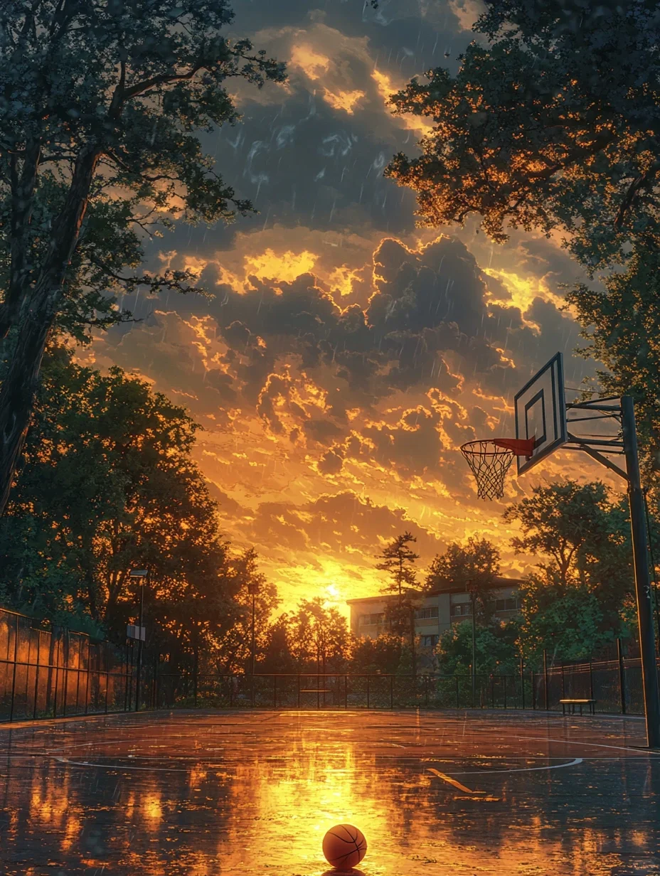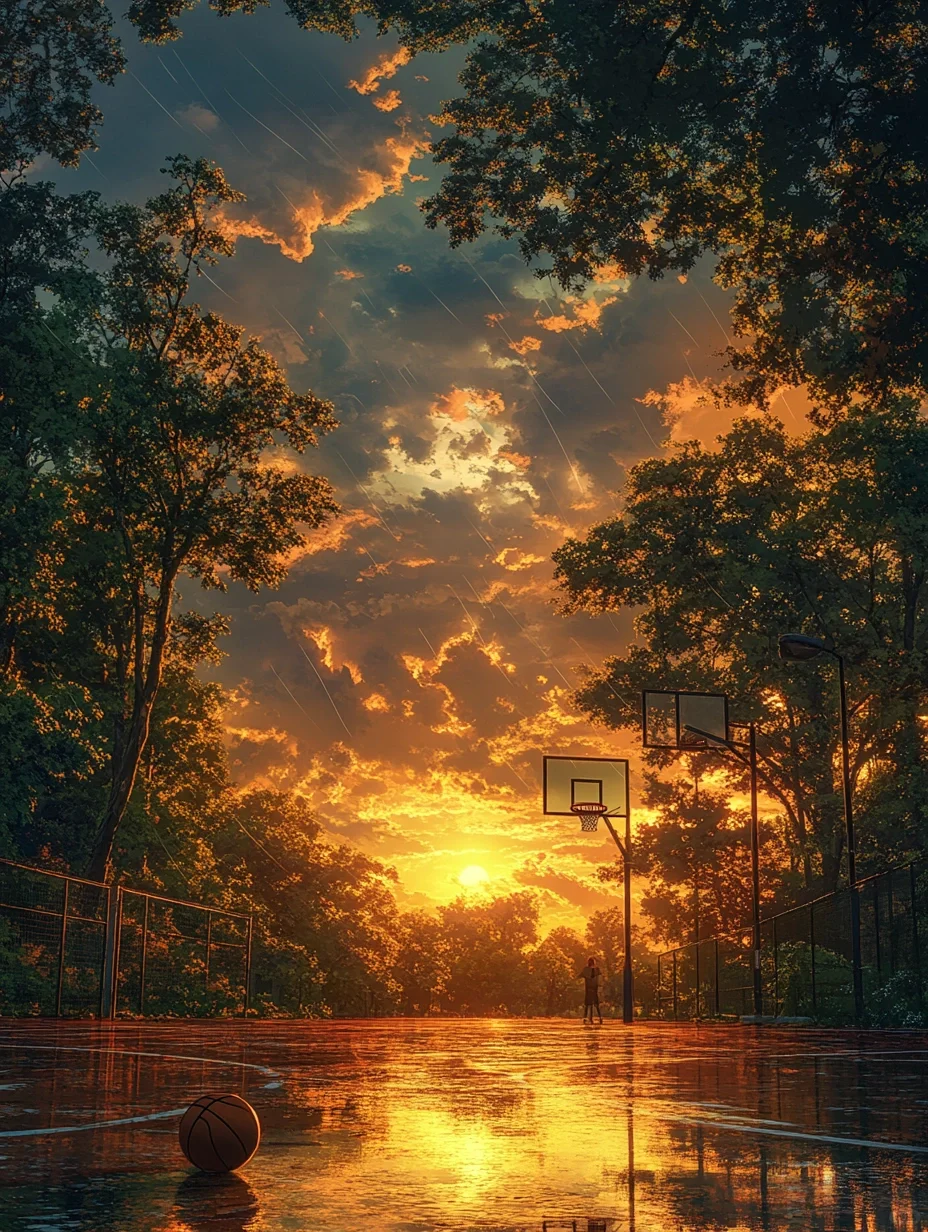 夕阳的余辉洒在安静的篮球场上,温柔地抚摸着每一寸地面。暑假中的这片场地,少了平日的喧嚣,多了一份静谧与悠然。一只篮球安静地躺在场中,仿佛在等待着某个少年的归来。天空渐渐染上橙色,树影婆娑,微风细语,心中的烦恼似乎在这一刻被慢慢抚平。