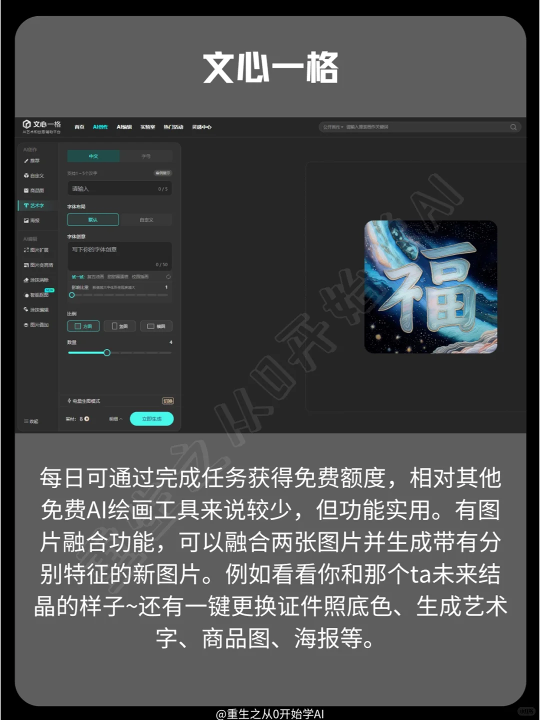 4、文心一格:每日可通过完成任务获得免费额度,相对其他免费AI绘画工具来说较少,但功能实用。有图片融合功能,可以融合两张图片并生成带有分别特征的新图片。例如看看你和那个ta未来结晶的样子~还有一键更换证件照底色、生成艺术字、商品图、海报等。