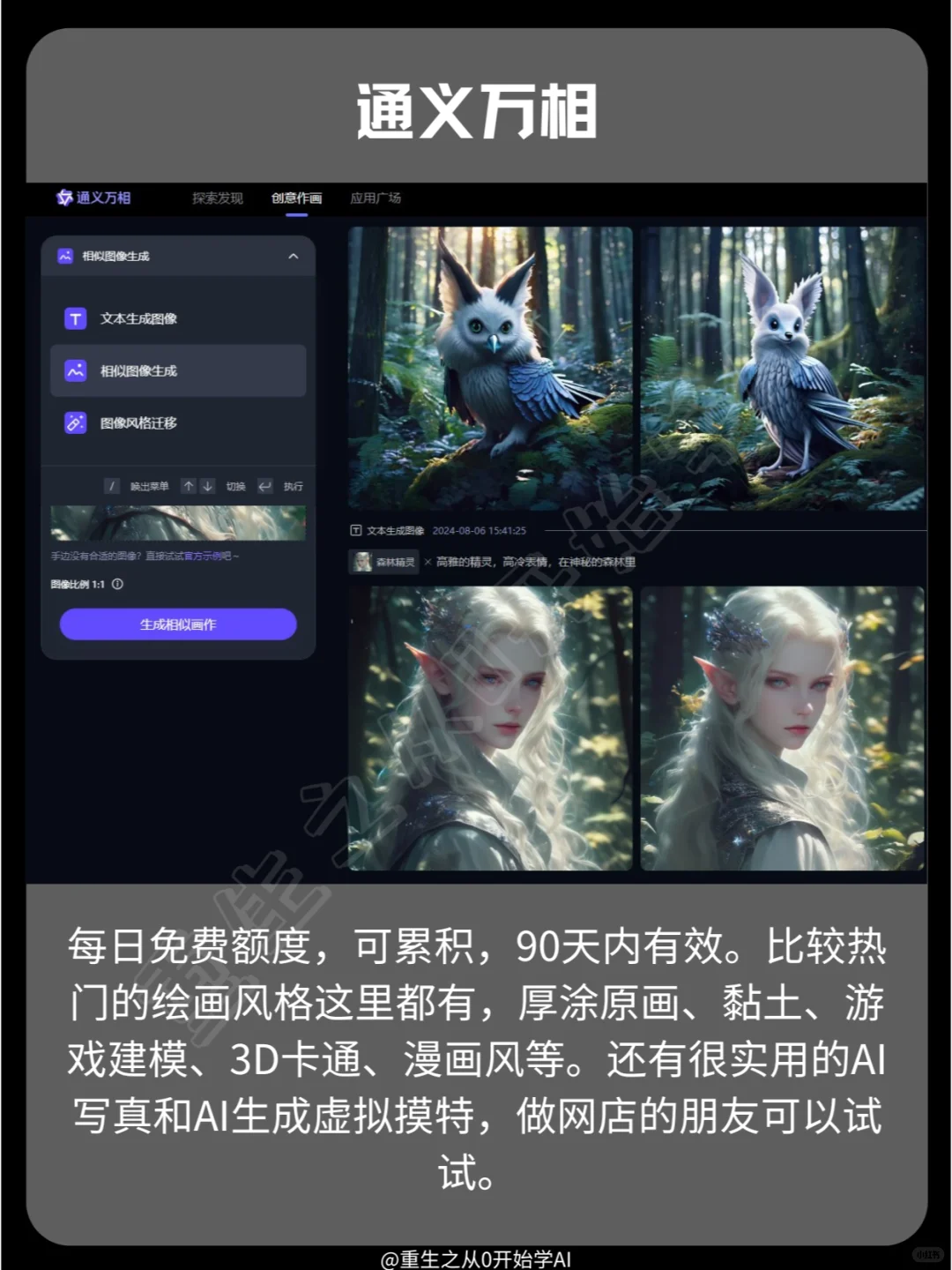 3、通义万相:每日免费额度,可累积,90天内有效。比较热门的绘画风格这里都有,厚涂原画、黏土、游戏建模、3D卡通、漫画风等。还有很实用的AI写真和AI生成虚拟摸特,做网店的朋友可以试试。
