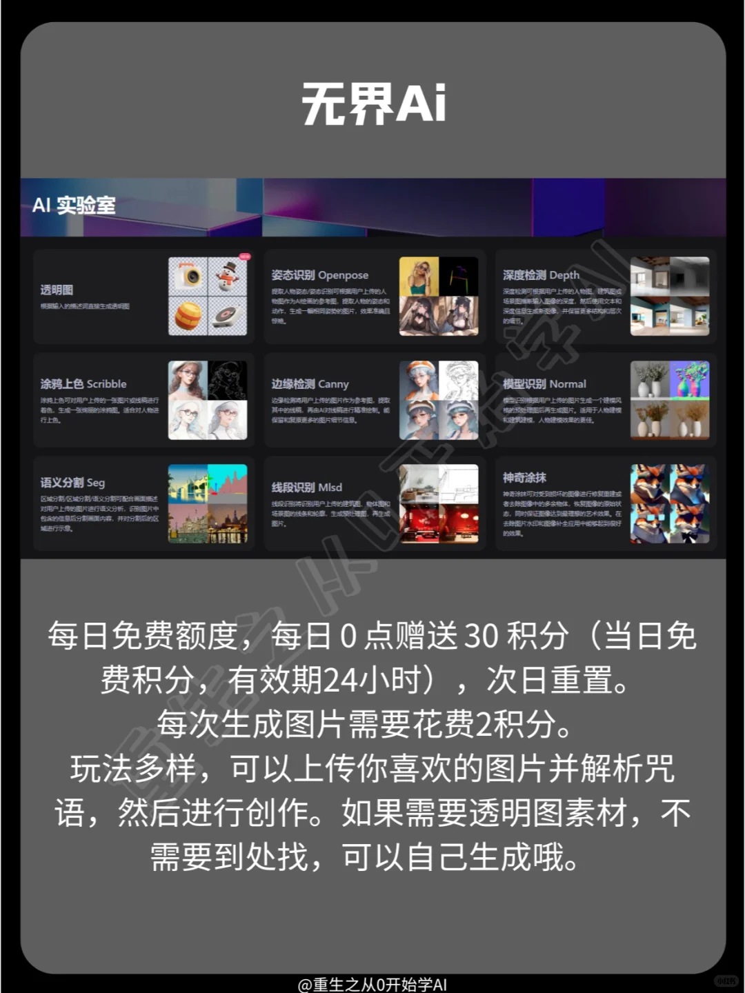 1、无界ai:每日免费额度,每日 0 点赠送 30 积分(当日免费积分,有效期24小时),次日重置。每次生成图片需要花费2积分。玩法多样,可以上传你喜欢的图片并解析咒语,然后进行创作。如果需要透明图素材,不需要到处找,可以自己生成哦。