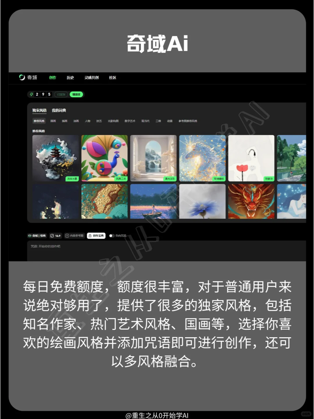 2、奇域ai:每日免费额度,额度很丰富,对于普通用户来说绝对够用了,提供了很多的独家风格,包括知名作家、热门艺术风格、国画等,选择你喜欢的绘画风格并添加咒语即可进行创作,还可以多风格融合。