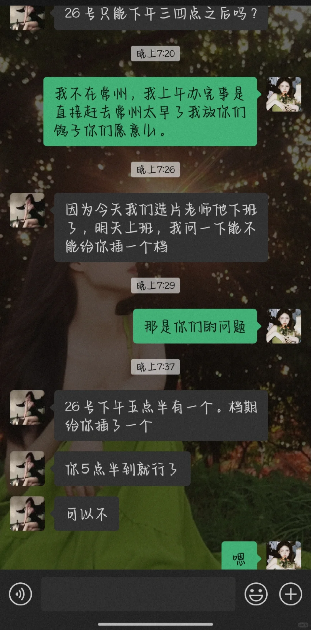 然后今年我是5月份多左右约的拍摄时间,我是联系的那个刚开始给我介绍的那个姐姐,因为刚开始我就只加了他的联系方式,他当时也说了,如果打算拍摄的话就联系她。所以我就只能联系她,我大概上下联系了他两三次,每次都是没有回复,都是隔个两三天才回复我。最后一次联系她跟我说让我联系他们的客服姐姐,然后我就加了他的联系方式嘛。