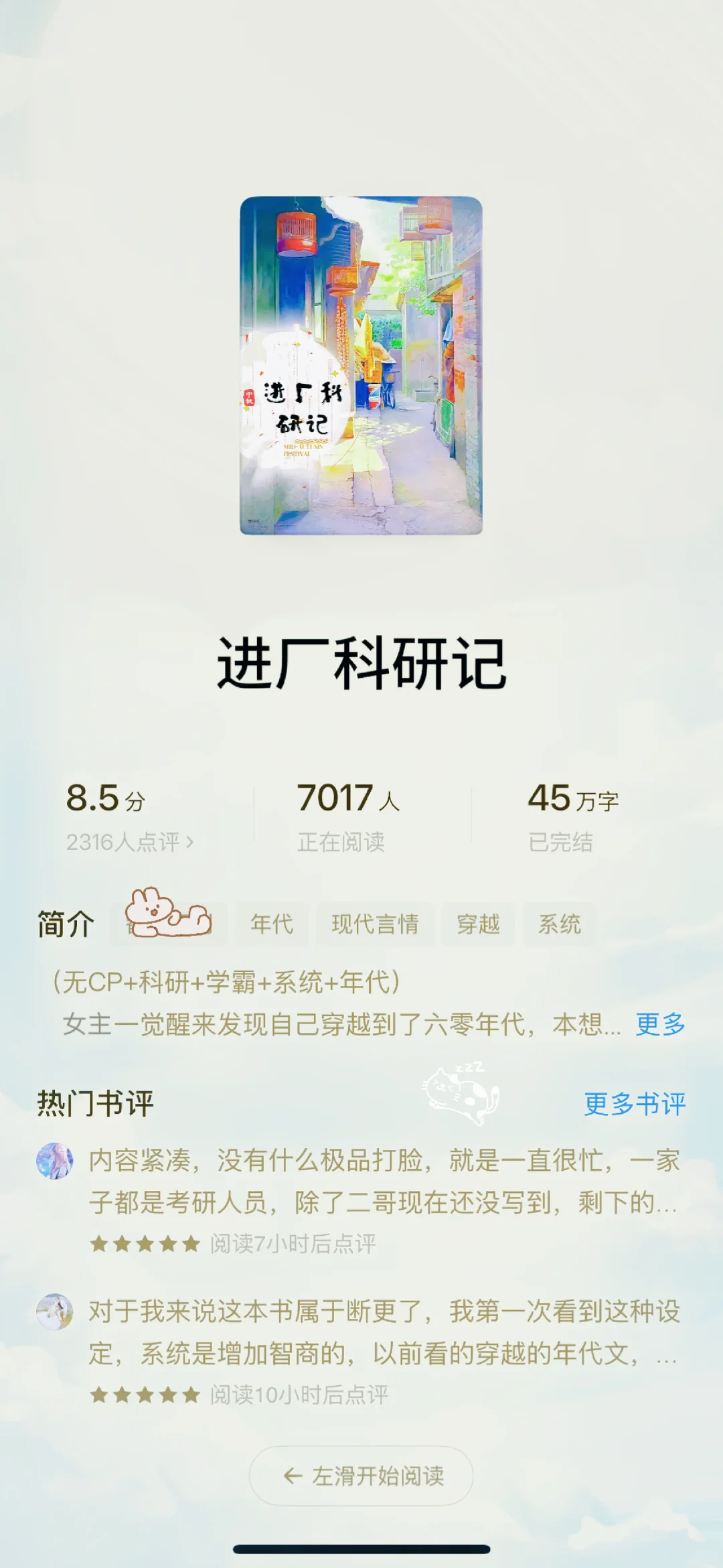 有铺垫,有起伏,超好看的。科研年代文,女主虽然有金手指,可是必须要自己努力学习,才能看到结果,通过不断的努力为国家的发展做出了重大贡献,比那些只能依靠系统的要好很多,所以女主的科研能力很强