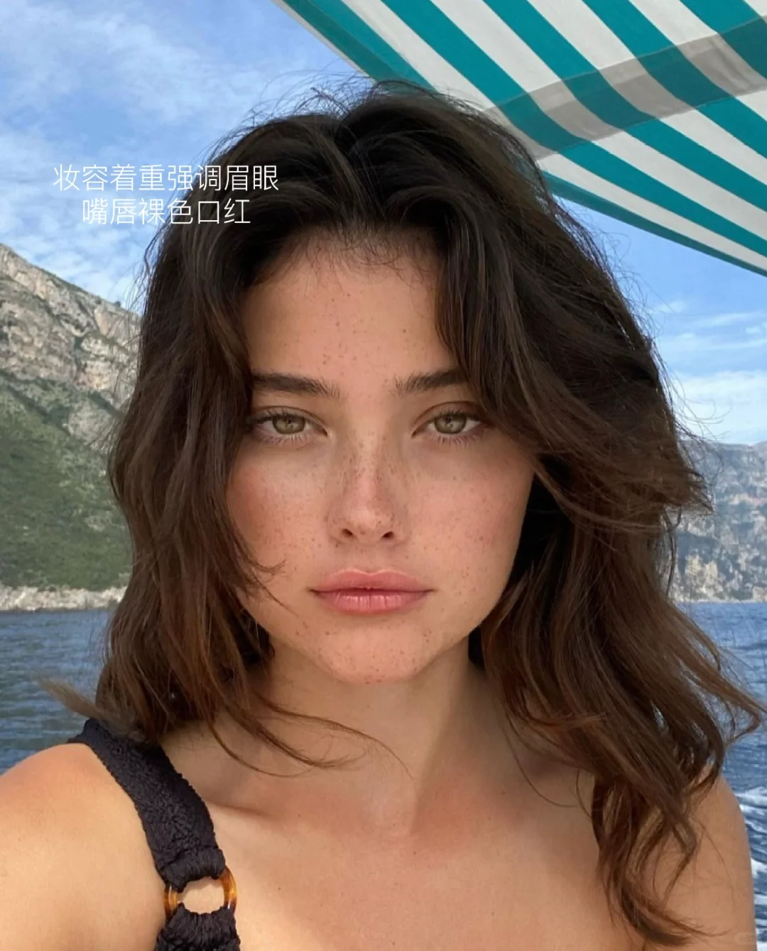 ✨妆容风格:突出眉眼,淡化嘴唇。眉毛和睫毛都是毛发感较浓,显得很有生命力。嘴唇几乎都是裸色。