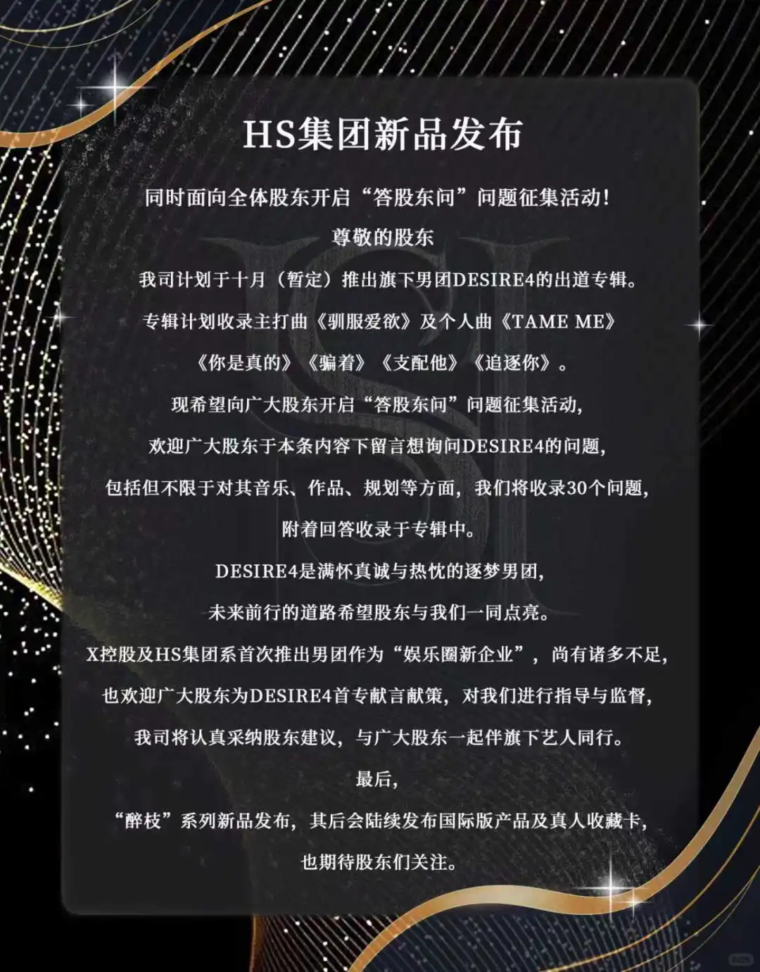 X控股及HS集团系首次推出男团,作为“娱乐圈新企业”,尚有诸多不足,也欢迎广大股东为DESIRE4首专献言献策,对我们进行指导与监督,我司将认真采纳股东建议,与广大股东一起伴旗下艺人同行。