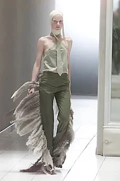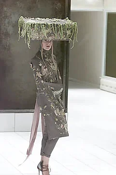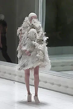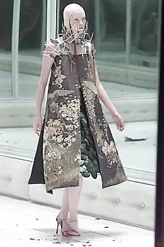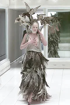 麦昆展现了自己的最佳状态:有哥特式的戏剧作品,比如一件裙子上有一个微型城堡和一只老鼠充当垫肩;由拼图做成的顶部;还有一个巨大的有羽毛的创作,模特头上悬挂着毛绒鹰,准备攻击la Hitchcock。但在所有的疯狂之中,有一大堆令人吃惊的优雅和可穿的长裤套装,荷叶边的派对礼服,甚至还有一两双观礼鞋。