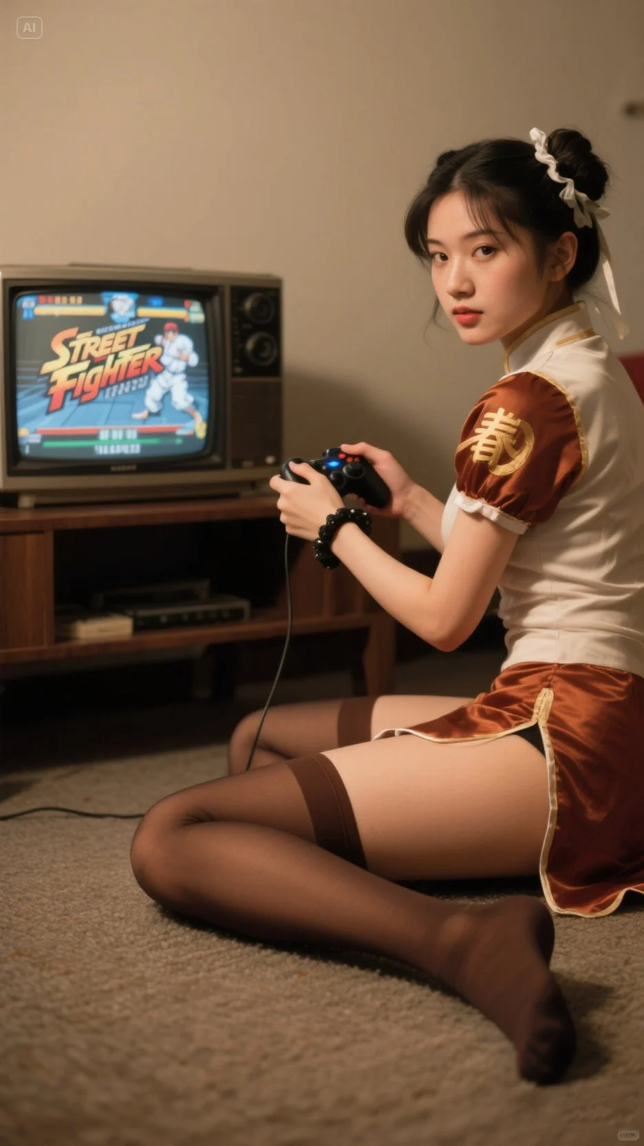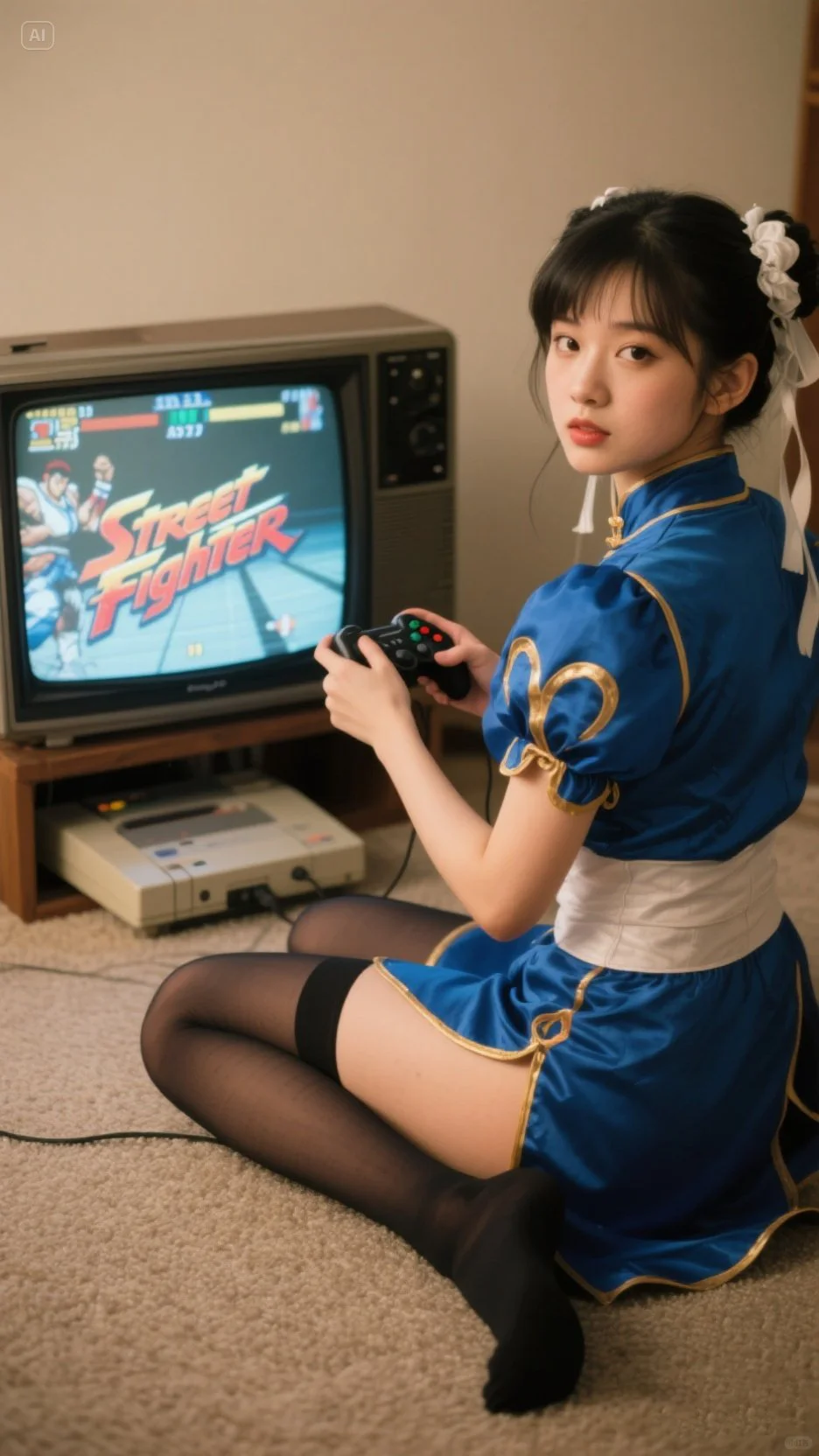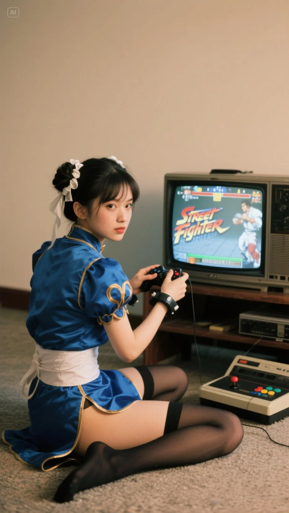 以真人写实风格呈现一位类似《街頭霸王》风格,春麗,春麗經典蓝色cosplay服,配黑色丝袜,正坐在地上用手柄玩“Street Fighter”格鬥游戏,游戏画面在老式CRT电视上显示。人物回头望向镜头,营造出怀旧且打破次元壁的氛围。 色调:图片的色彩比较柔和,没有过于鲜艳的颜色,整体偏向中性色调,带有一点复古的暖色滤镜效果。 光影效果:光线柔和,没有强烈的对比或高光,给人一种安静、沉稳的氛围。 颗粒感:画面中有一些轻微的颗粒感,类似于胶片摄影的效果,增强了复古感。 构图:人物坐在地上,手持游戏手柄,游戏机的摆放位置,营造出一种怀旧的氛围,仿佛回到了上世纪80年代或90年代的场景。 这张图片通过色调、光影和构图,成功营造了一种怀旧、复古的风格,让人联想到过去的年代。