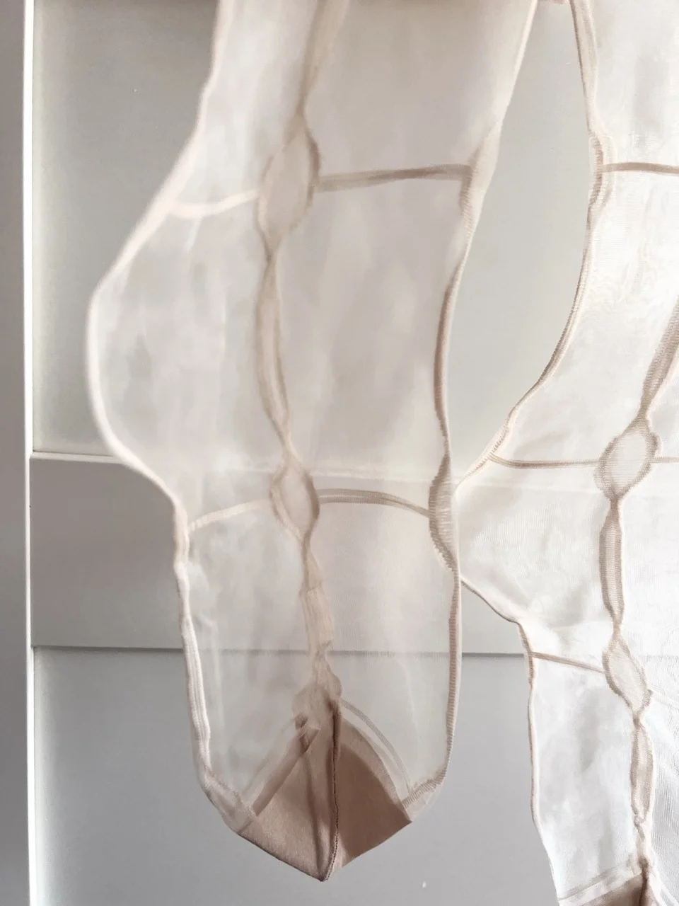 花纹是通过针织张力变化与纱线排列形成的“环链结构”,可视为早期的艺术性织纹丝袜;