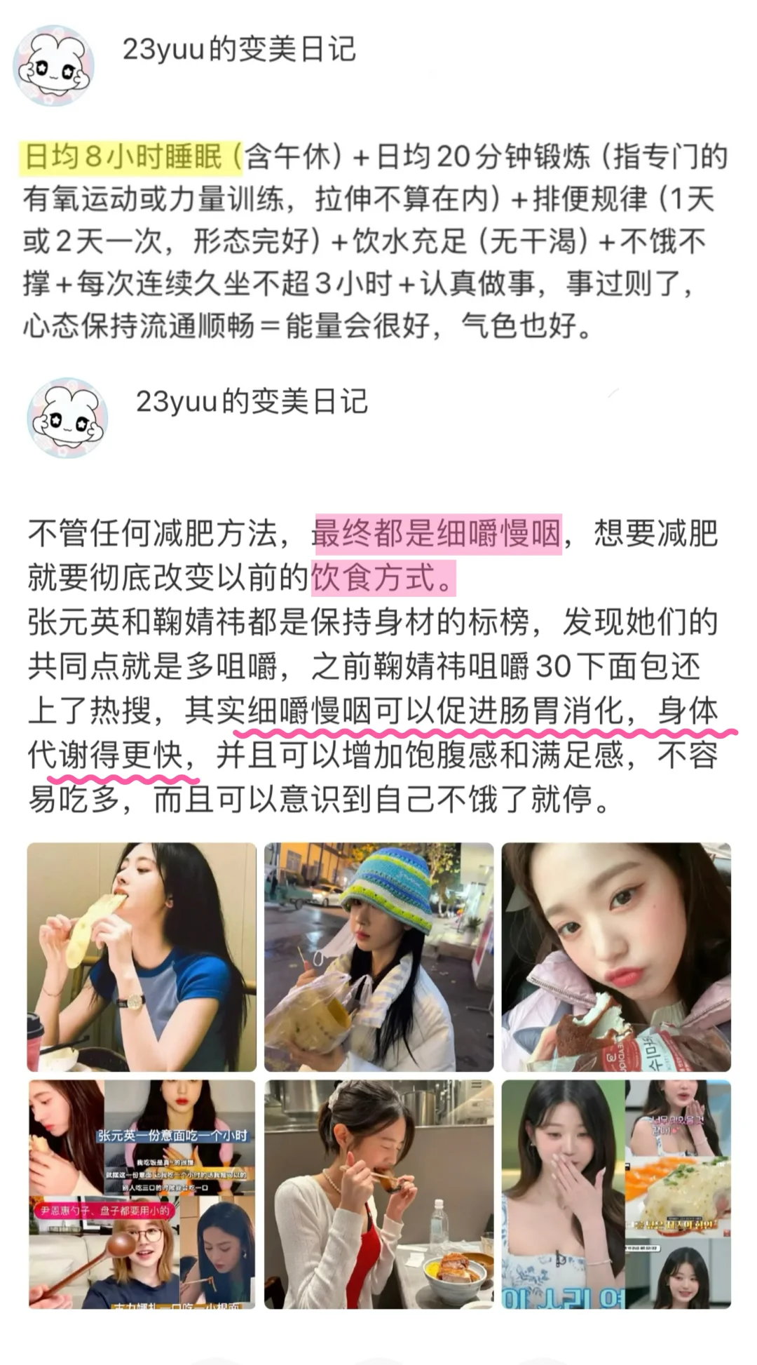 张元英和鞠婧祎都是保持身材的标榜,发现她们的共同点就是多咀嚼,之前鞠婧祎咀嚼30下面包还上了热搜,其实细嚼慢咽可以促进肠胃消化,身体代谢得更快,并且可以增加饱腹感和满足感,不容易吃多,而且可以意识到自己不饿了就停。