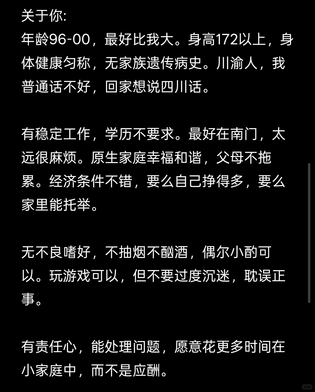 年龄96-00,最好比我大。身高172以上,身体健康匀称,无家族遗传病史。川渝人,我普通话不好,回家想说四川话。