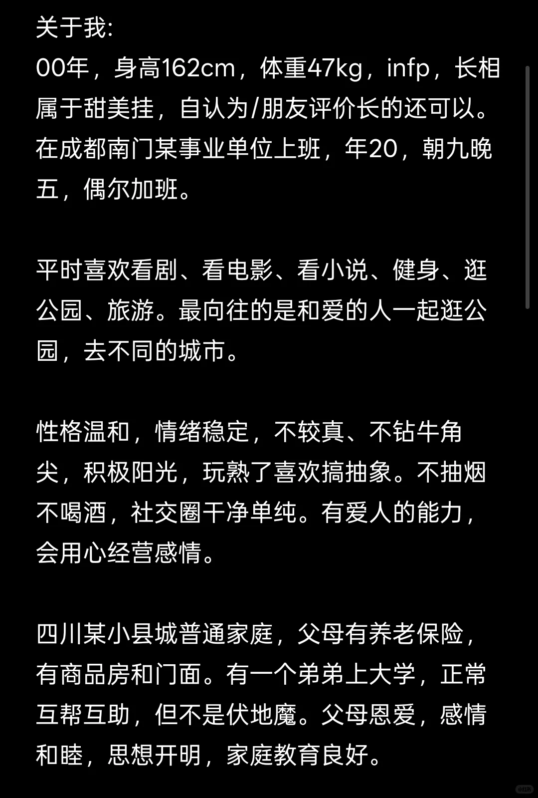 00年,身高162cm,体重47kg,infp,长相属于甜美挂,自认为/朋友评价长的还可以。在成都南门某事业单位上班,年20,朝九晚五,偶尔加班。