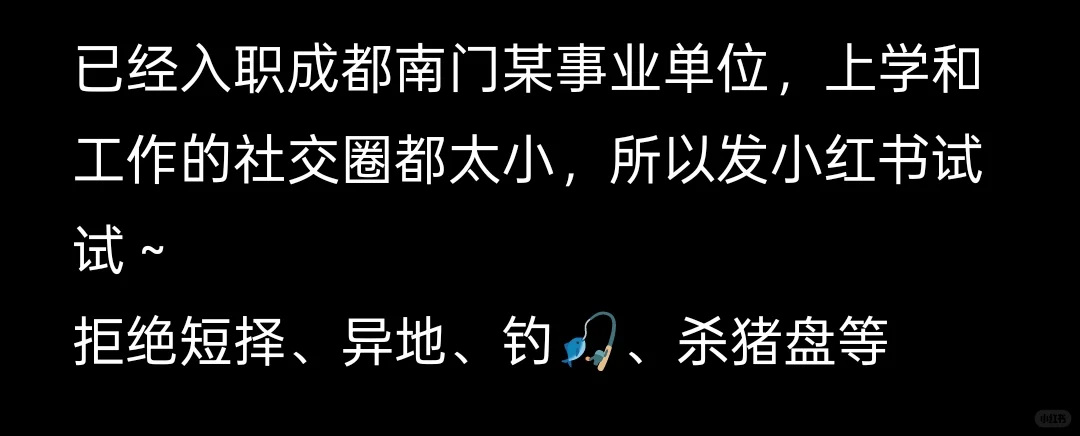已经入职成都南门某事业单位,上学和工作的社交圈都太小,所以发小红书试试~