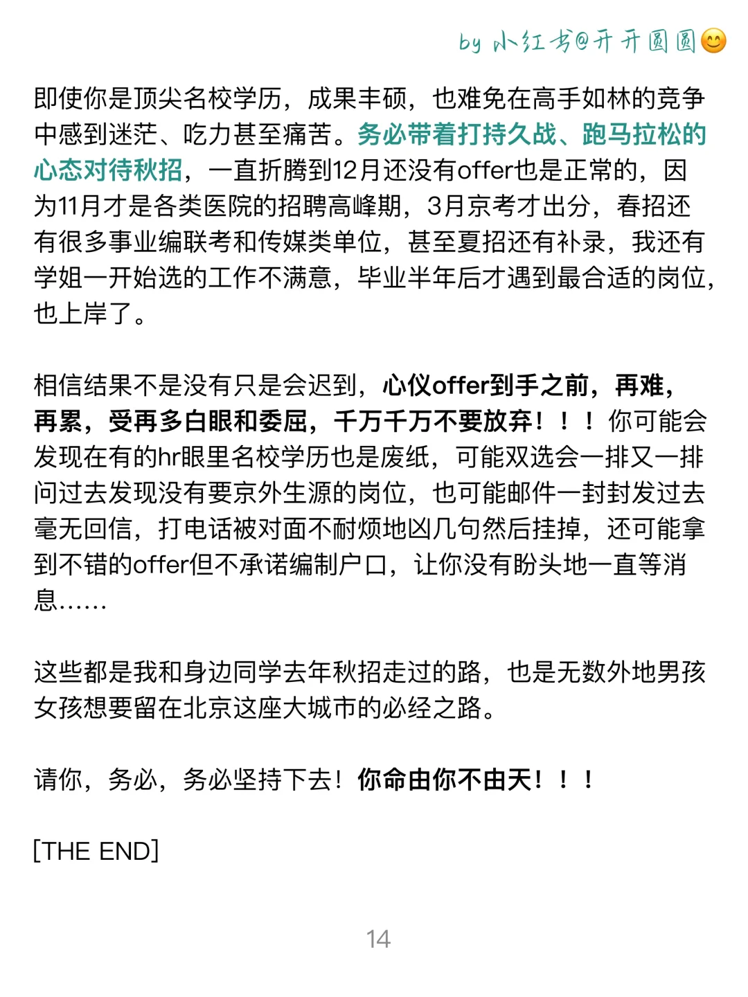 即使名校傍身,在北京的秋招市场也注定会面临自尊心的揉搓。一定要抱着跑马拉松的心态,好饭不怕晚,务必务必坚持下去!因为正是白眼和冷脸,铺成了无数外地男孩女孩的留京之路
