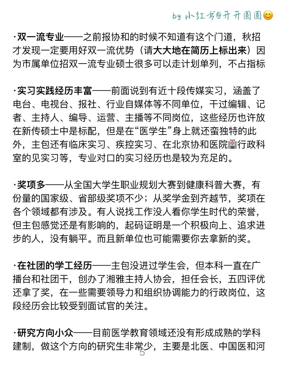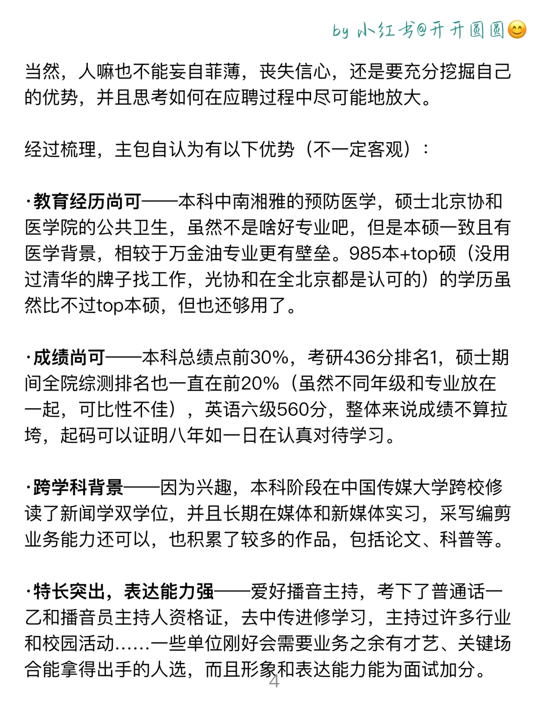 我的优势主要涵盖教育经历(湘雅➡️协和)、过往的积累(如新传、播音的跨学科背景)和个人胜任力这些软性要素,此外还有较为小众的研究方向。这些决定了求职选岗的倾向性以及面试突出展示的内容