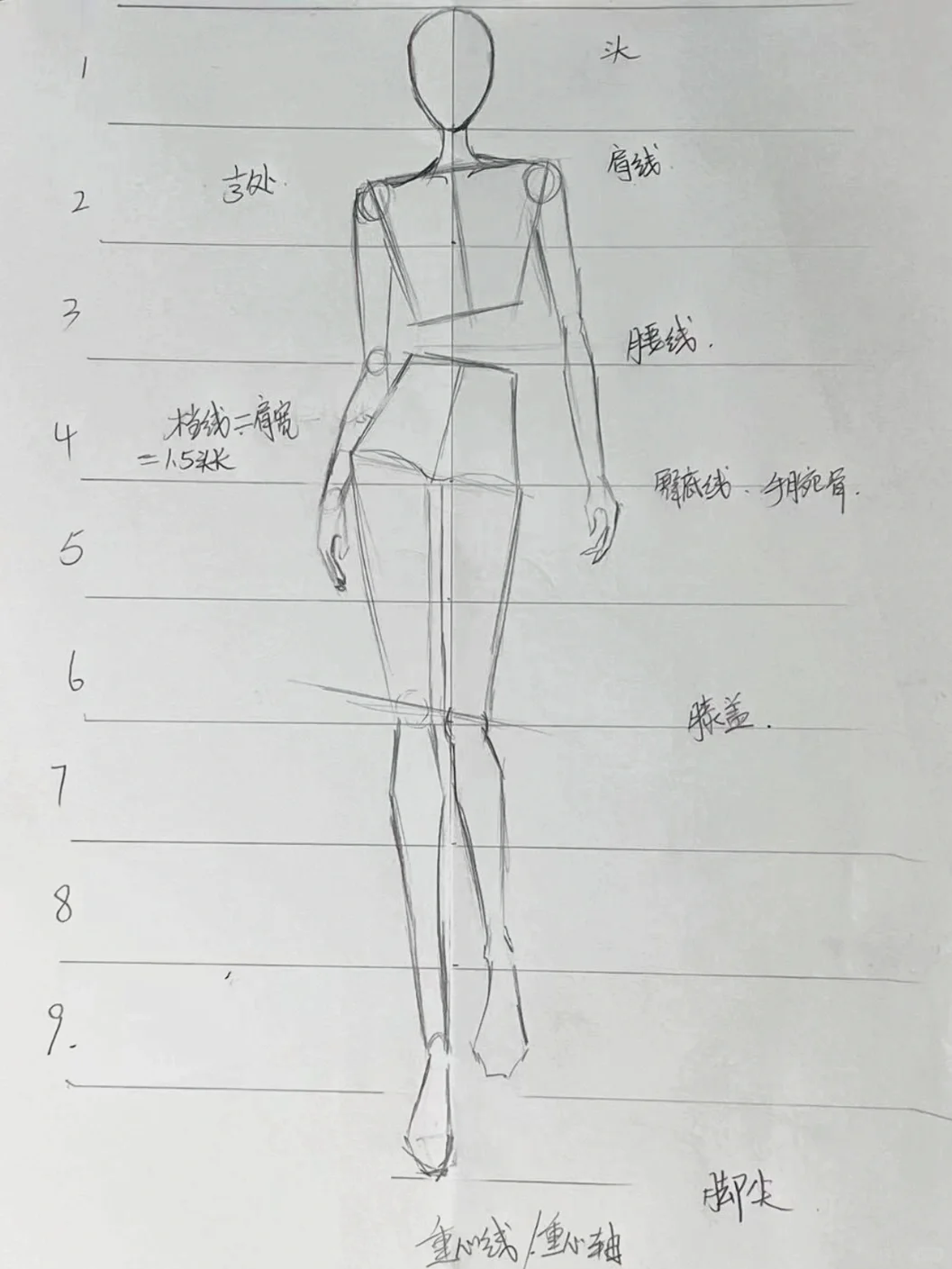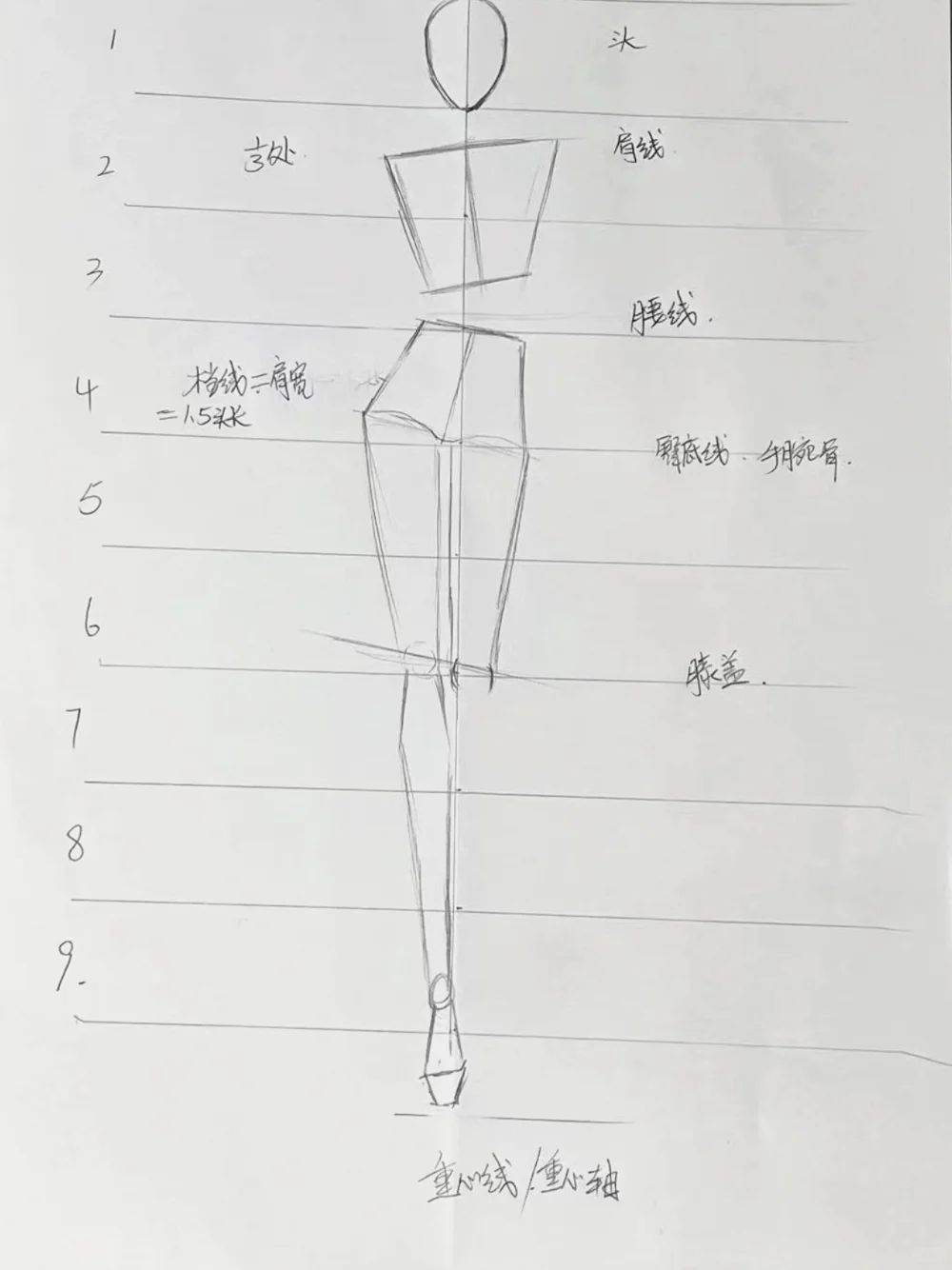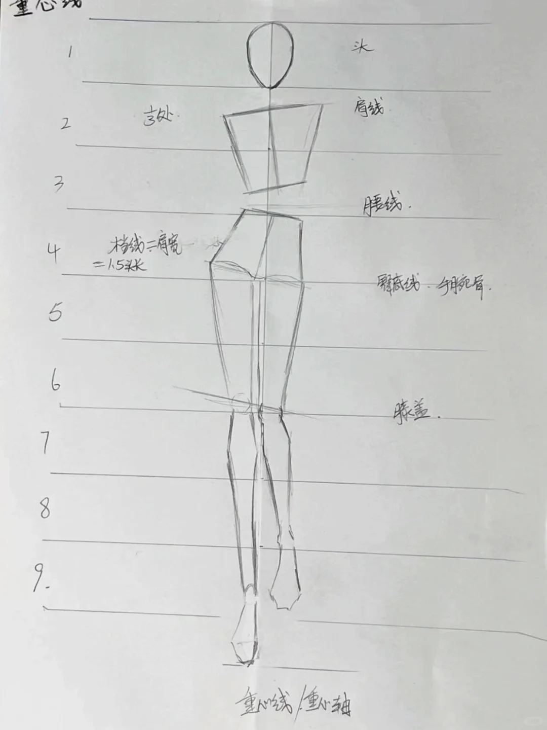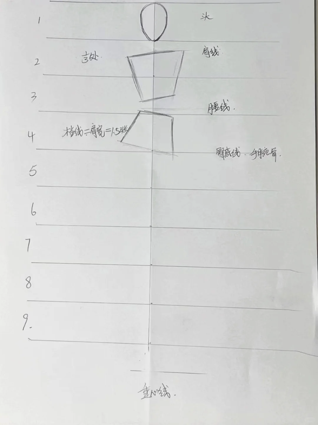 画一条垂直线(重心线),分9等份。头用椭圆,胸腔倒梯形,盆腔正梯形,四肢用圆柱体概括。