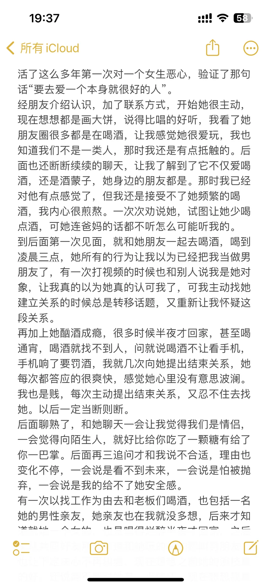 再加上她酗酒成瘾,很多时候半夜才回家,甚至喝通宵,喝酒就找不到人,问就说喝酒不让看手机,手机响了要罚酒,我就几次向她提出结束关系,她每次都答应的很爽快,感觉她心里没有意思波澜。我也是贱,每次主动提出结束关系,又忍不住去找她。以后一定当断则断。