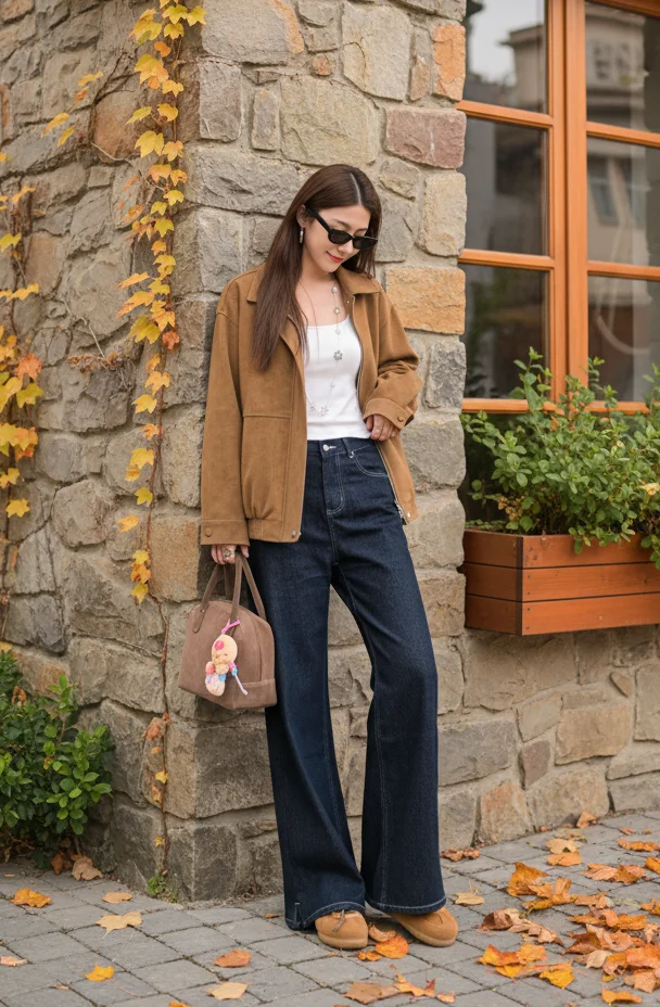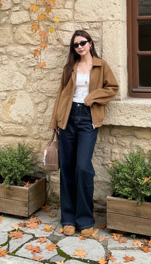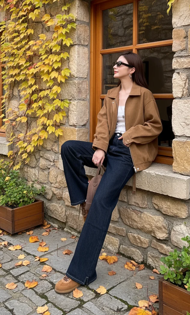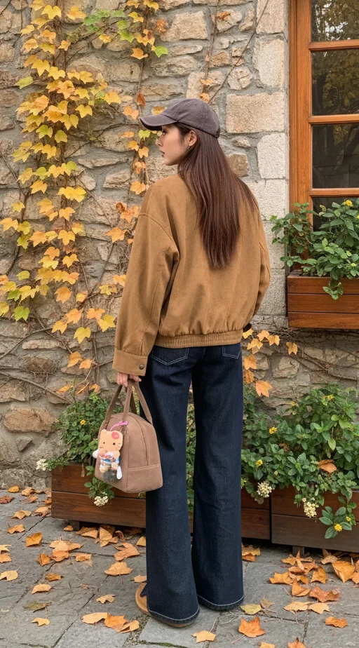 ### 背景环境 画面呈现**户外复古建筑旁的场景**:背景是带有自然纹理的石墙,墙面上爬满黄绿交织的藤蔓植物,增添了生机与复古感;右侧有一扇木质窗框的窗户,质感温润;下方是木质花箱,内部栽种着翠绿的植物,与石墙形成自然搭配;地面为石板铺就,散落着橙黄的秋叶,进一步点明秋日氛围。 ### 布景 以**复古石墙建筑**为核心布景元素,搭配木质窗户、嵌有绿植的木质花箱,以及地面散落的秋叶,自然元素与复古建筑质感相互融合,营造出兼具自然生机与复古格调的场景,细节丰富且协调。 ### 氛围 整体氛围**悠闲惬意且充满秋日复古感**:石墙、木质结构的复古质感,结合秋叶与绿植的自然气息,再加上人物穿搭的松弛感,传递出一种在秋日里漫游、享受慢时光的闲适情调,温暖又有格调。 ### 光照 采用**柔和的秋日自然光**,光线明亮却不刺眼,均匀洒落在场景与人物身上。暖调的光线为石墙、秋叶镀上温馨色泽,也让绿植的翠绿、衣物的色彩更显饱满,整体光线层次柔和,进一步烘托出悠闲惬意的秋日氛围。