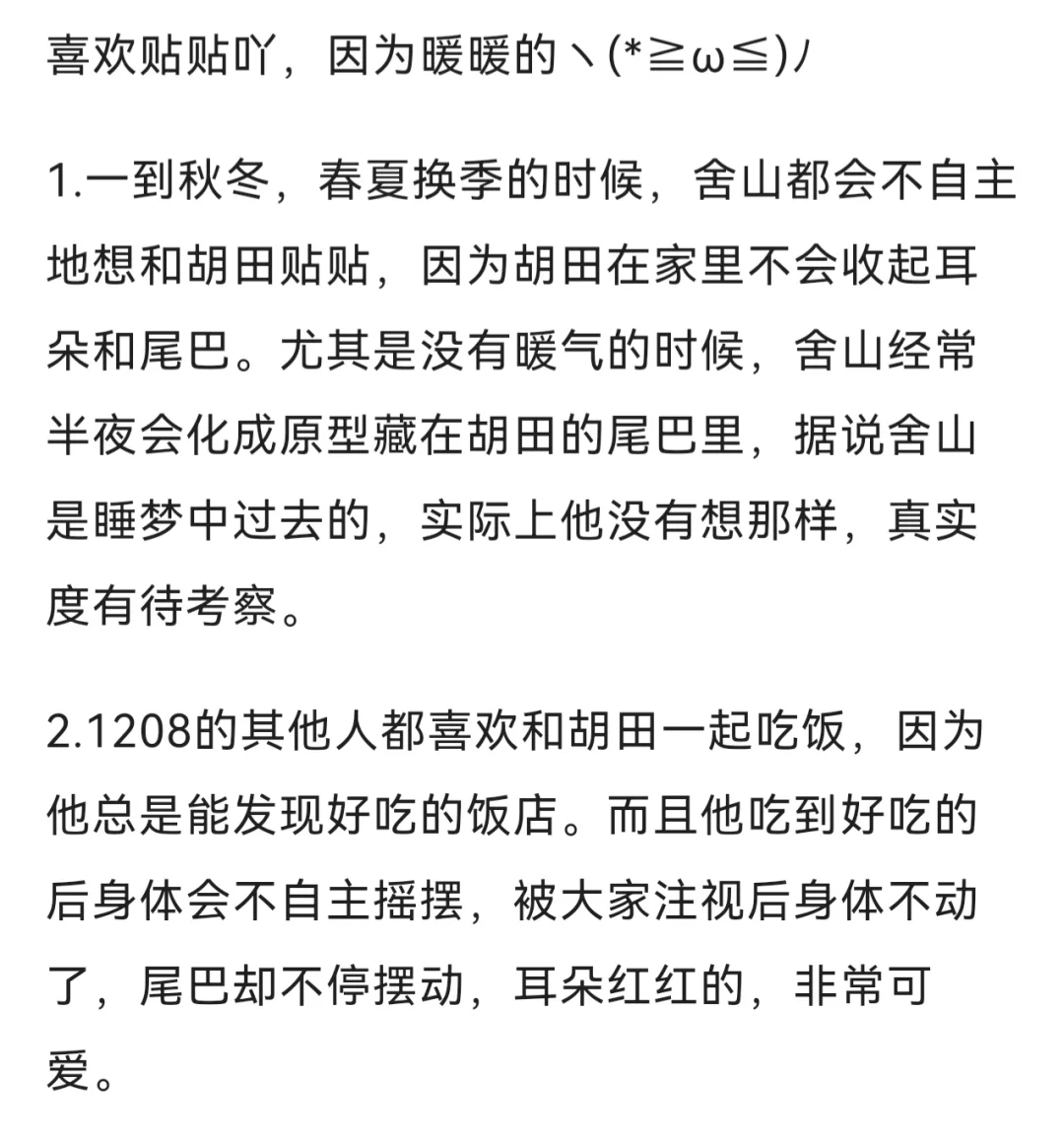 1.一到秋冬,春夏换季的时候,舍山都会不自主地想和胡田贴贴,因为胡田在家里不会收起耳朵和尾巴。尤其是没有暖气的时候,舍山经常半夜会化成原型藏在胡田的尾巴里,据说舍山是睡梦中过去的,实际上他没有想那样,真实度有待考察。