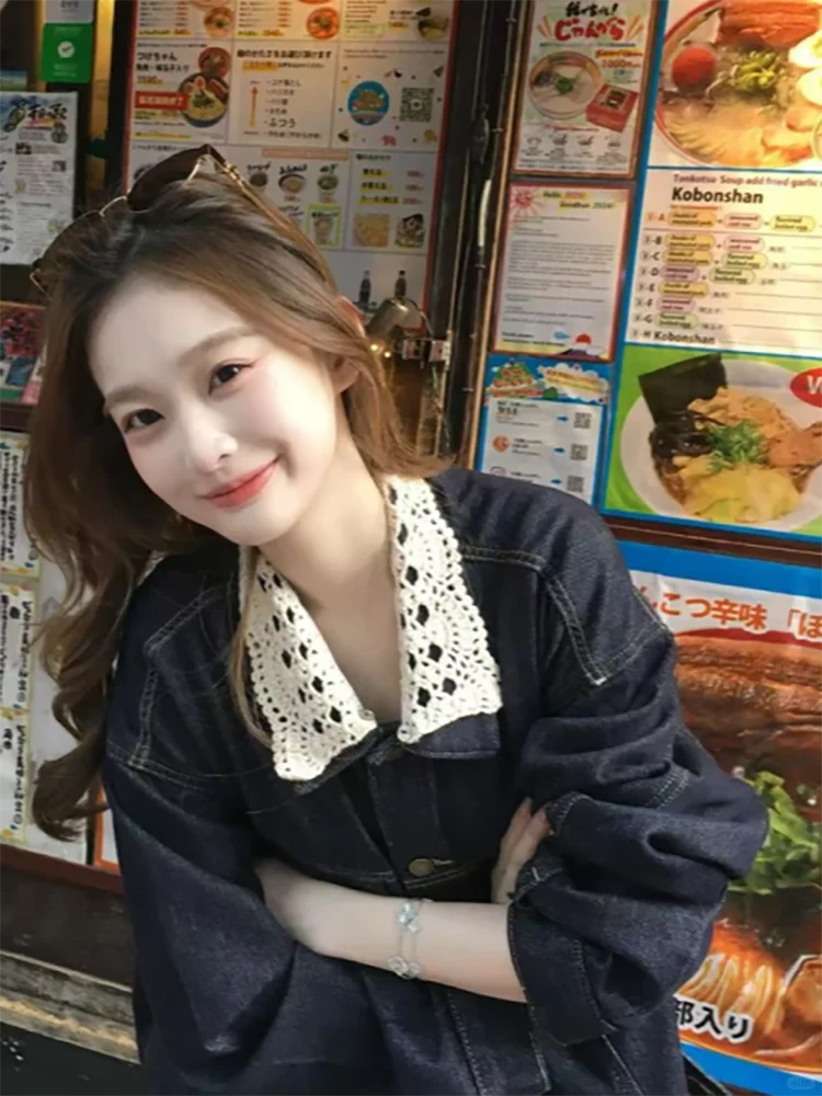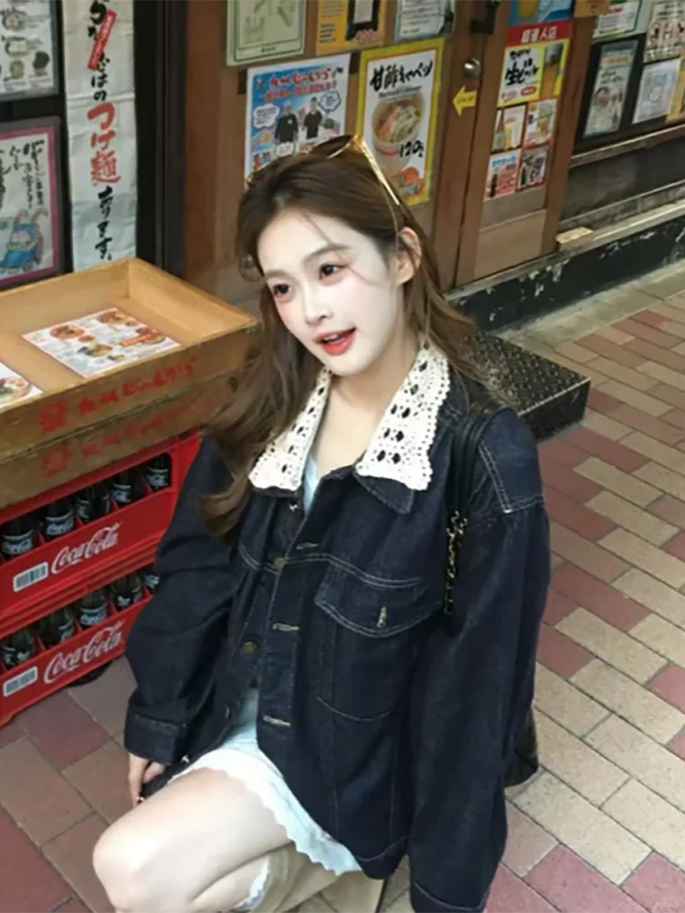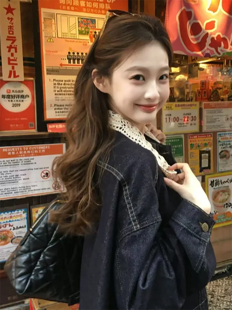 绅士Y【理部牛仔】 拼接蕾丝设计牛仔外套气质时尚秋季开衫上衣女
