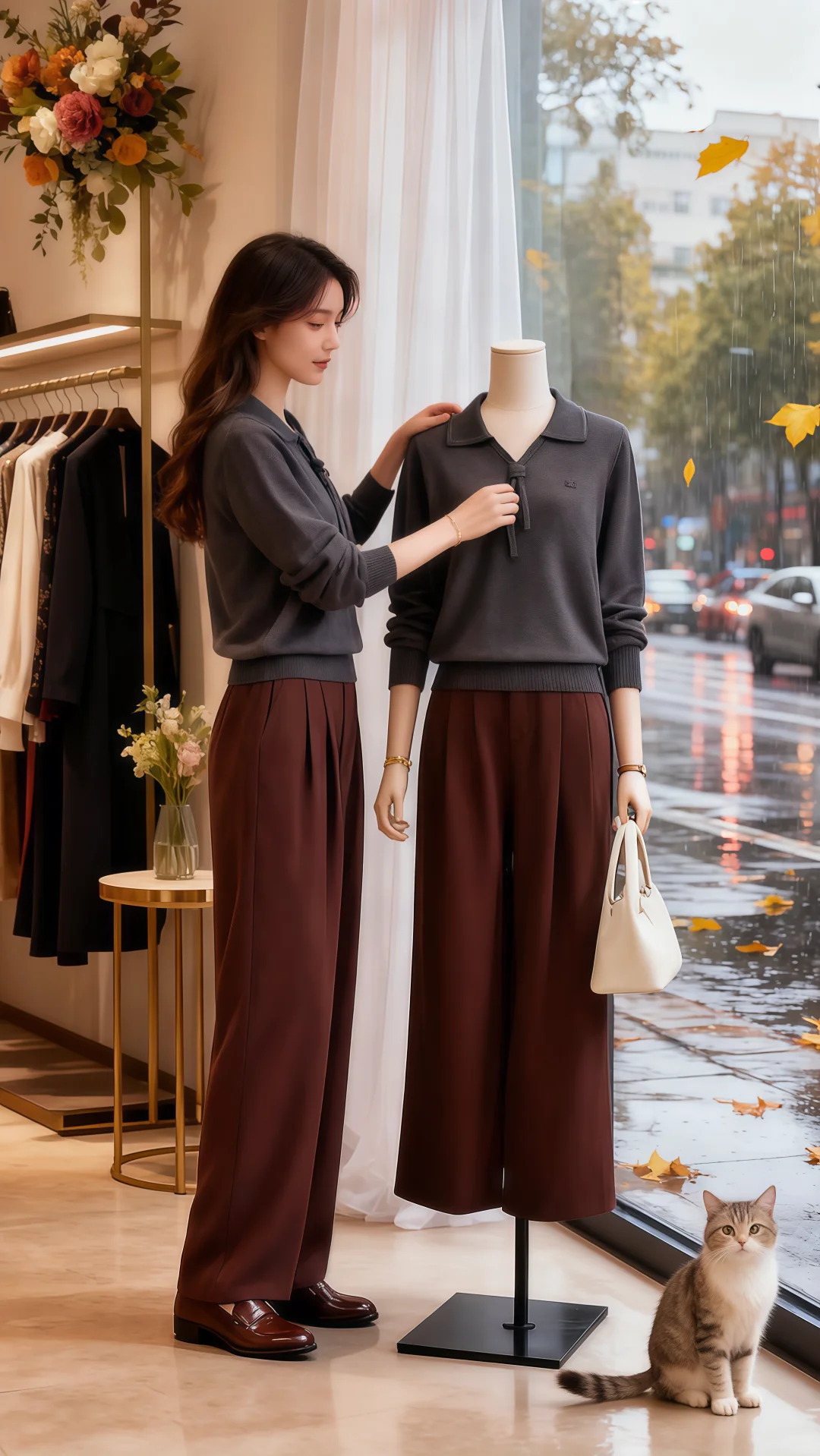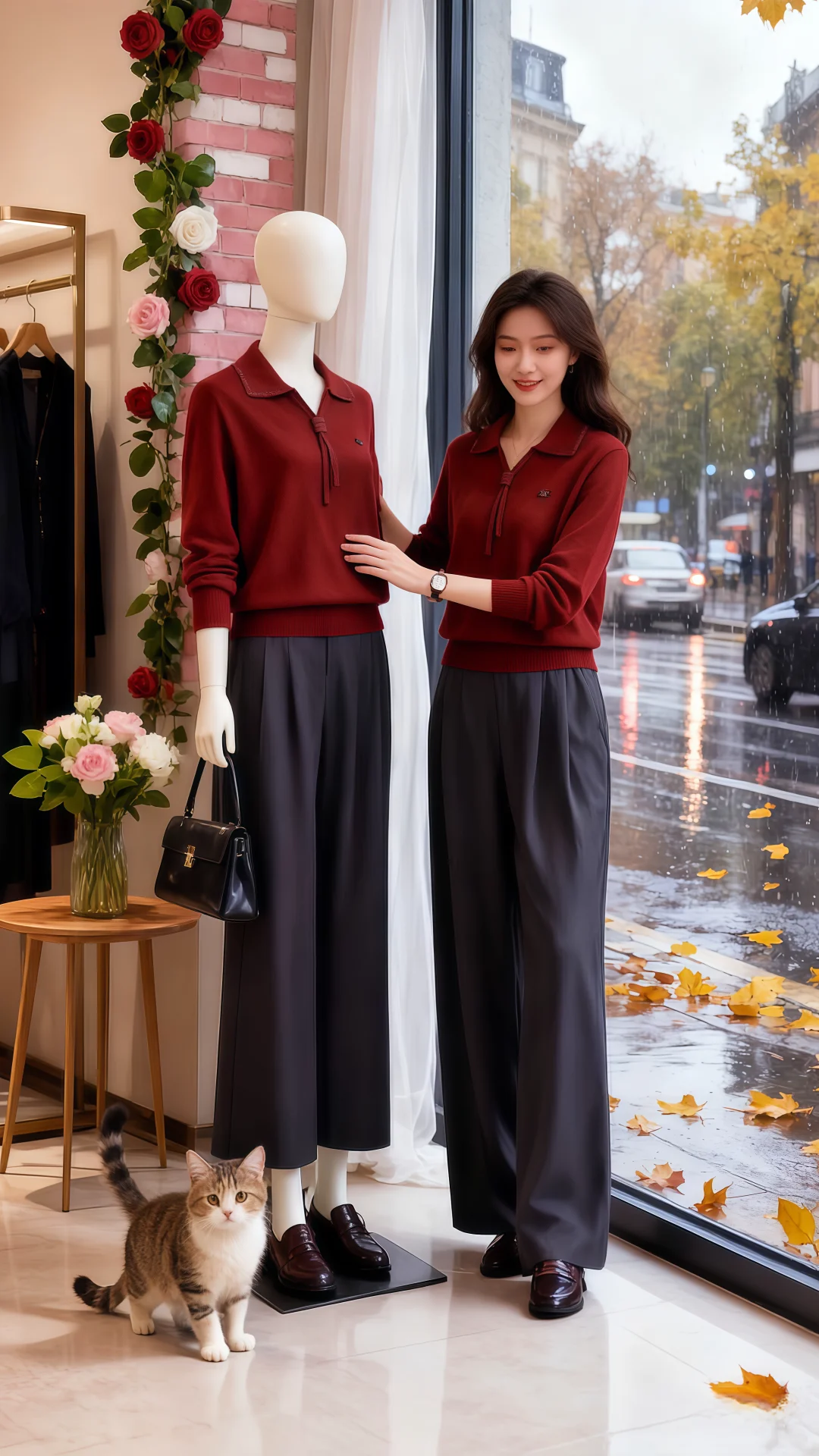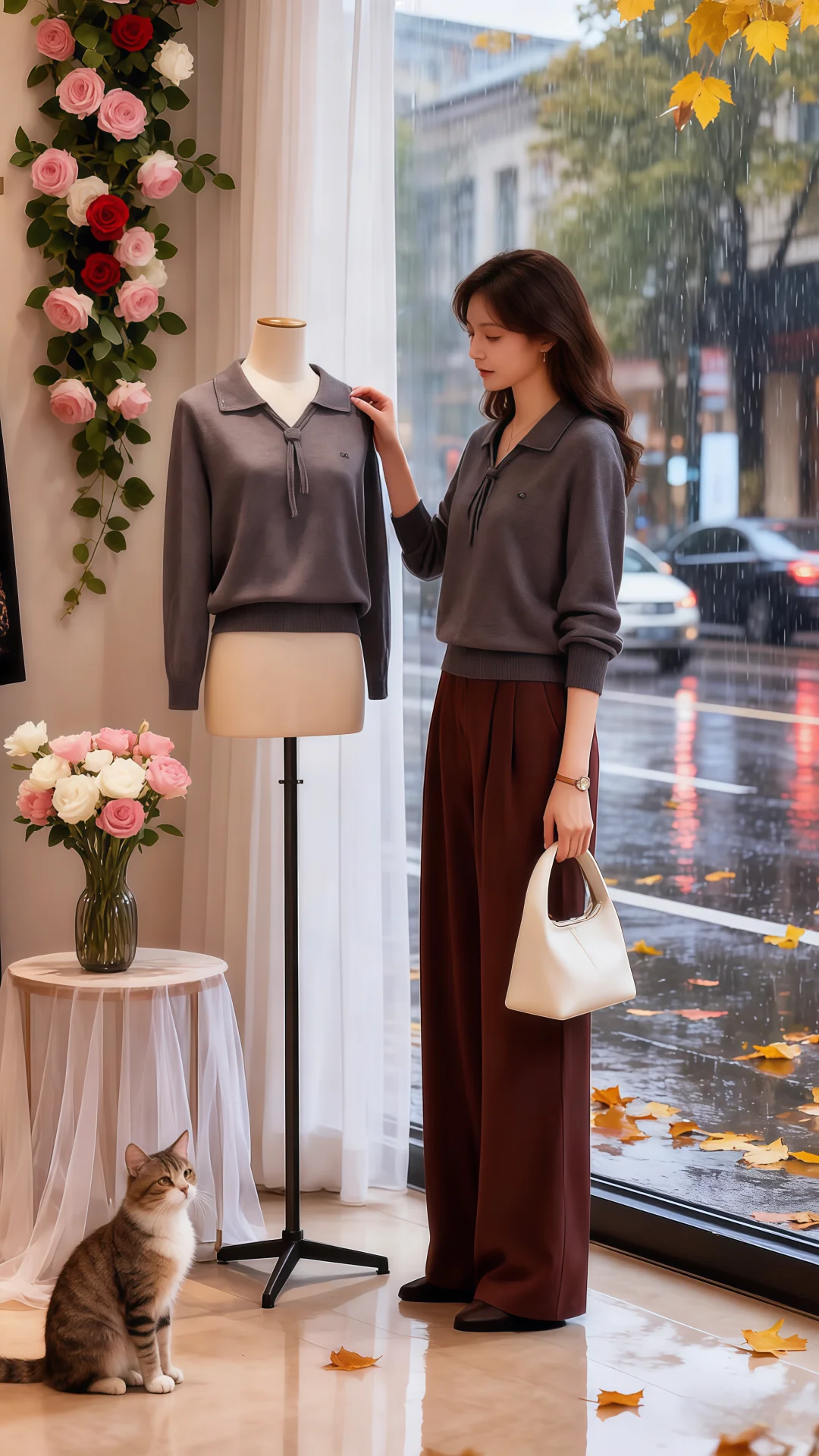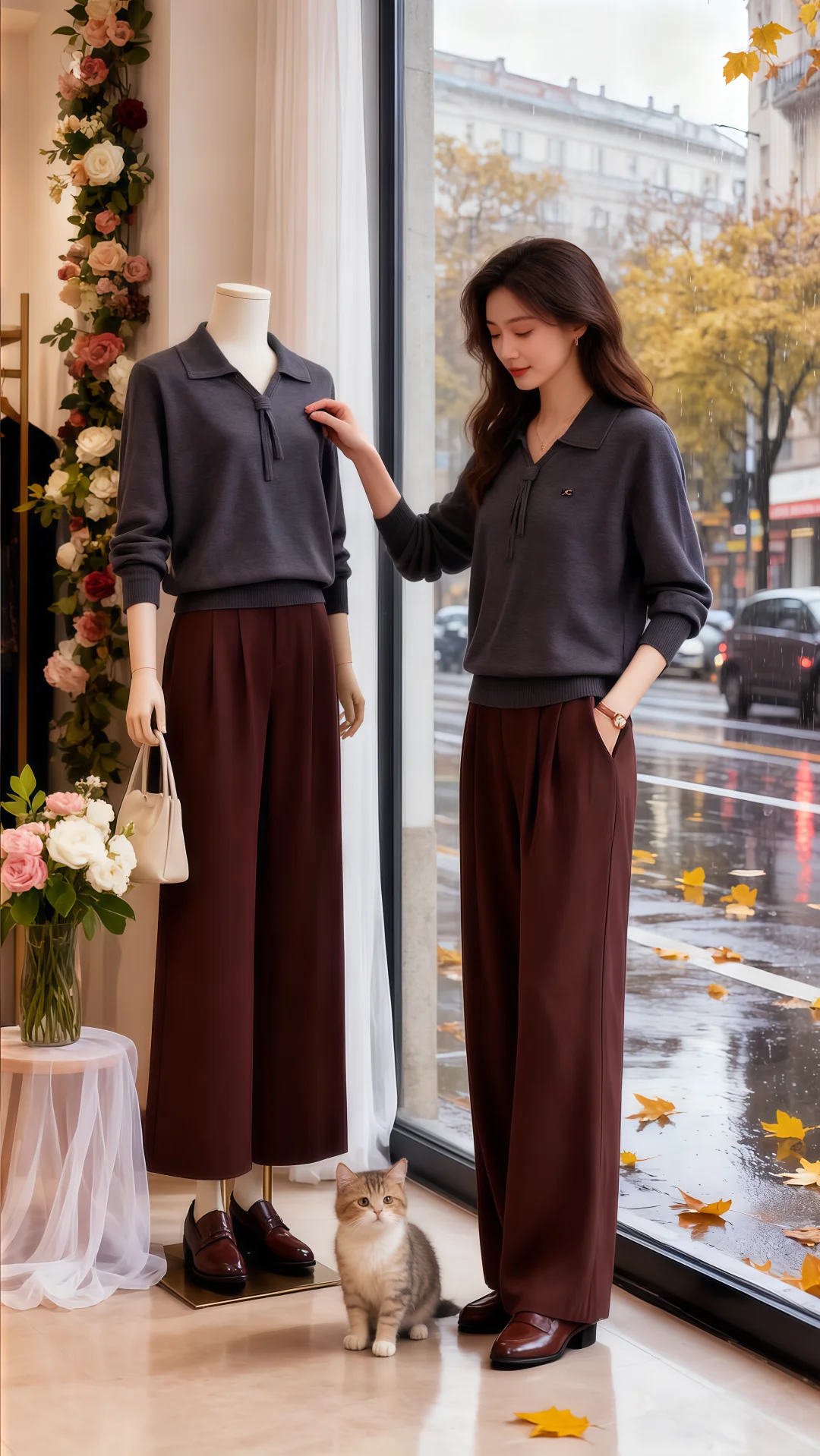 红毛衣搭阔腿裤的搭配,在朦胧雨幕衬映下,格外亮眼。她走近,指尖轻触毛衣,软糯触感从指腹漫开,像把秋日温软全攥在手里。