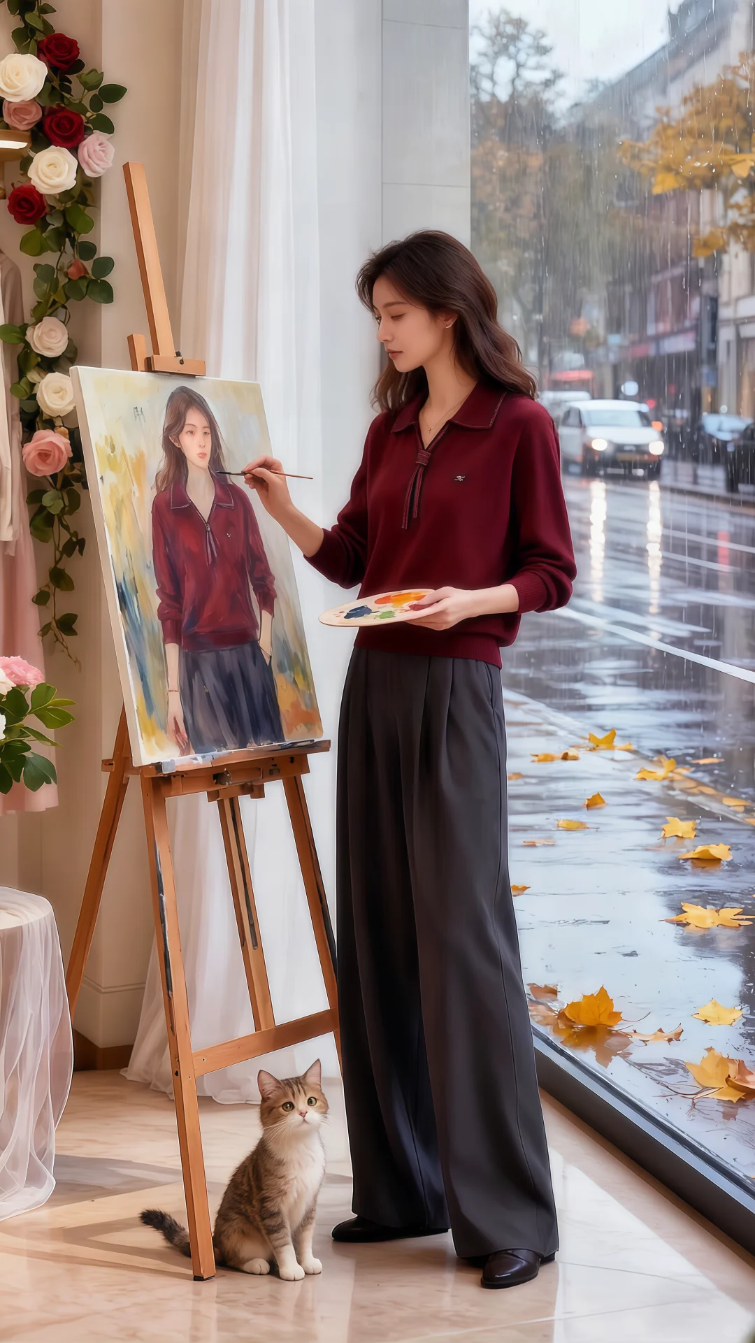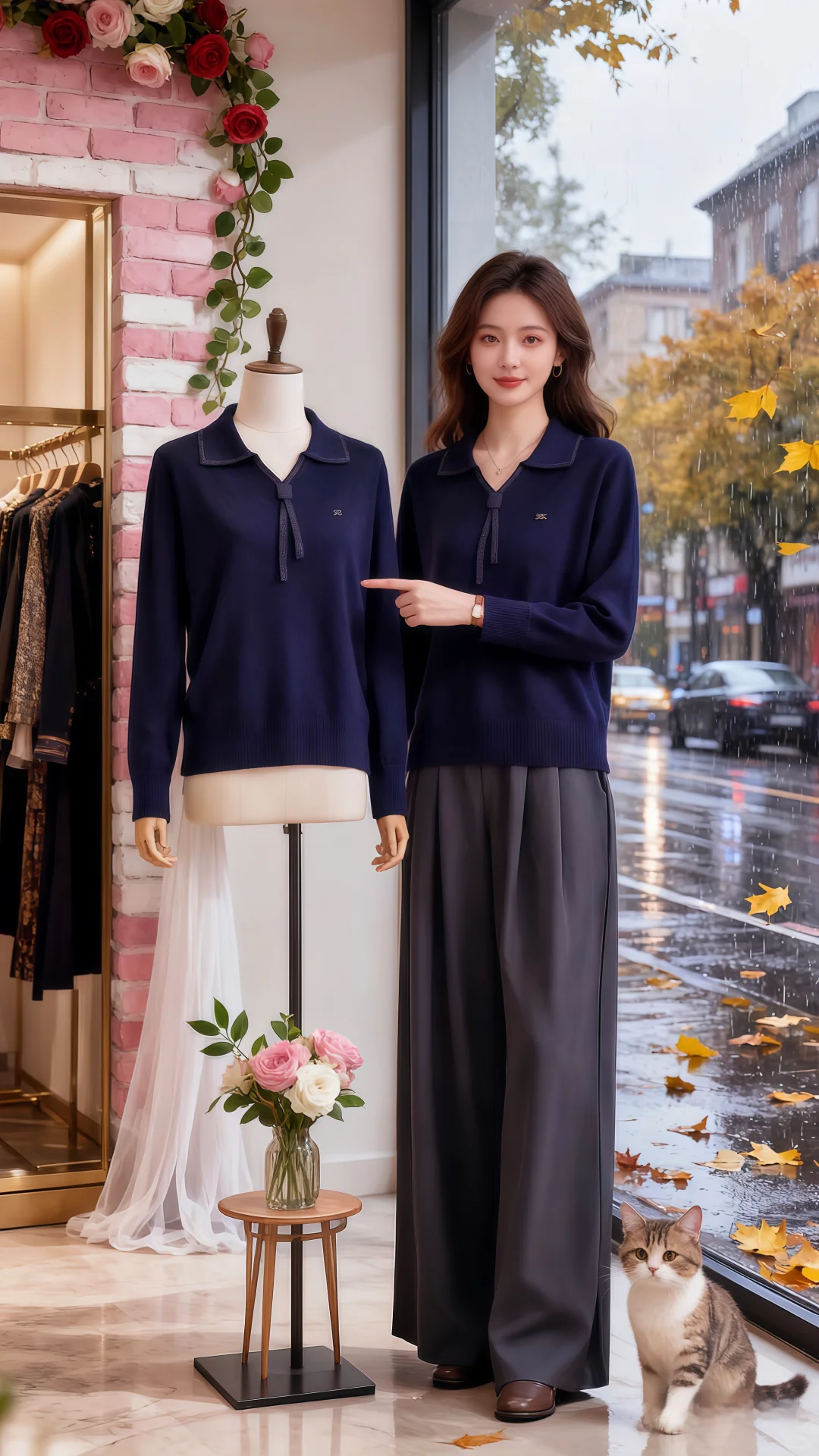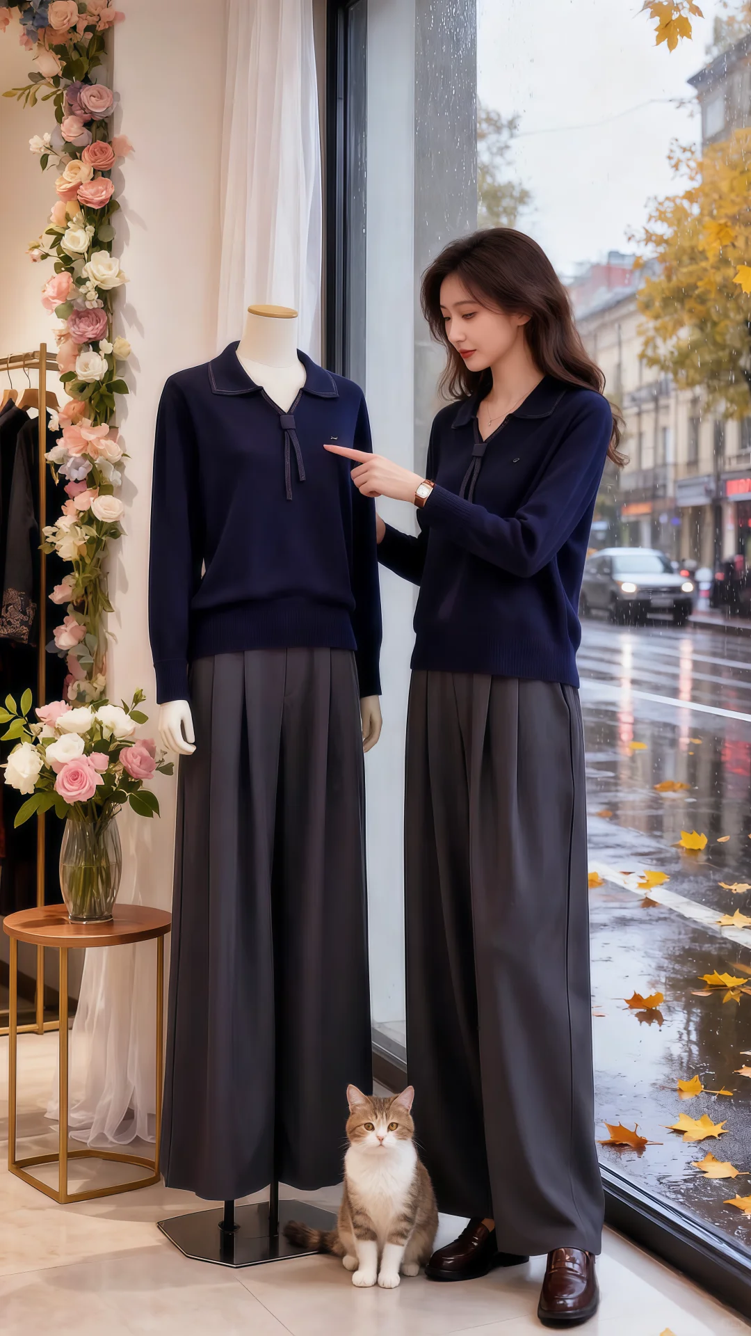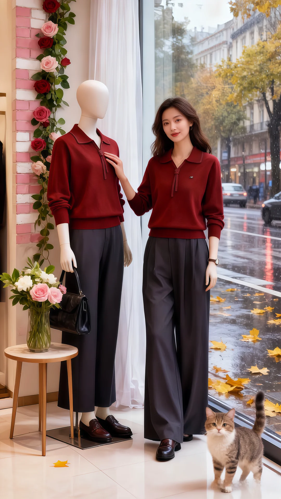 红毛衣搭阔腿裤的搭配,在朦胧雨幕衬映下,格外亮眼。她走近,指尖轻触毛衣,软糯触感从指腹漫开,像把秋日温软全攥在手里。