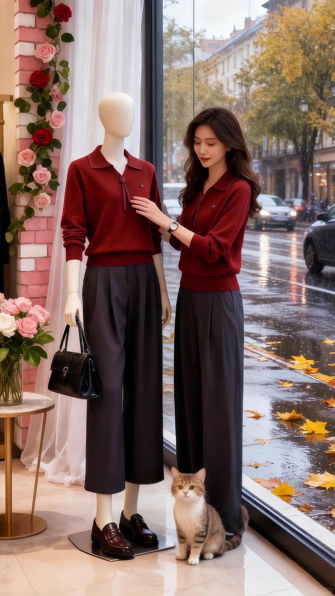秋雨淅淅沥沥,打湿了街道。她路过那家常逛的服装店,橱窗里一抹红,像暗涌的心动,拽住她脚步。