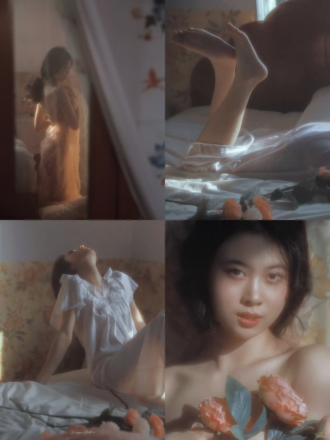 🌈第二,镜头蒙纱或者用柔光镜。可以把女孩子身体的“柔美”用照片呈现出来。我蒙纱拍的比较多,但是蒙纱不能拍全逆光,容易全糊。