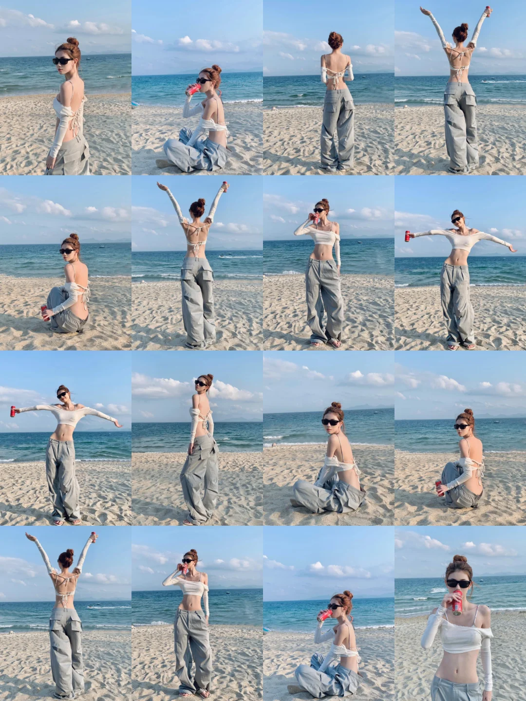 1️⃣ 漫步海边,单手微微扬起,像是在触摸海风