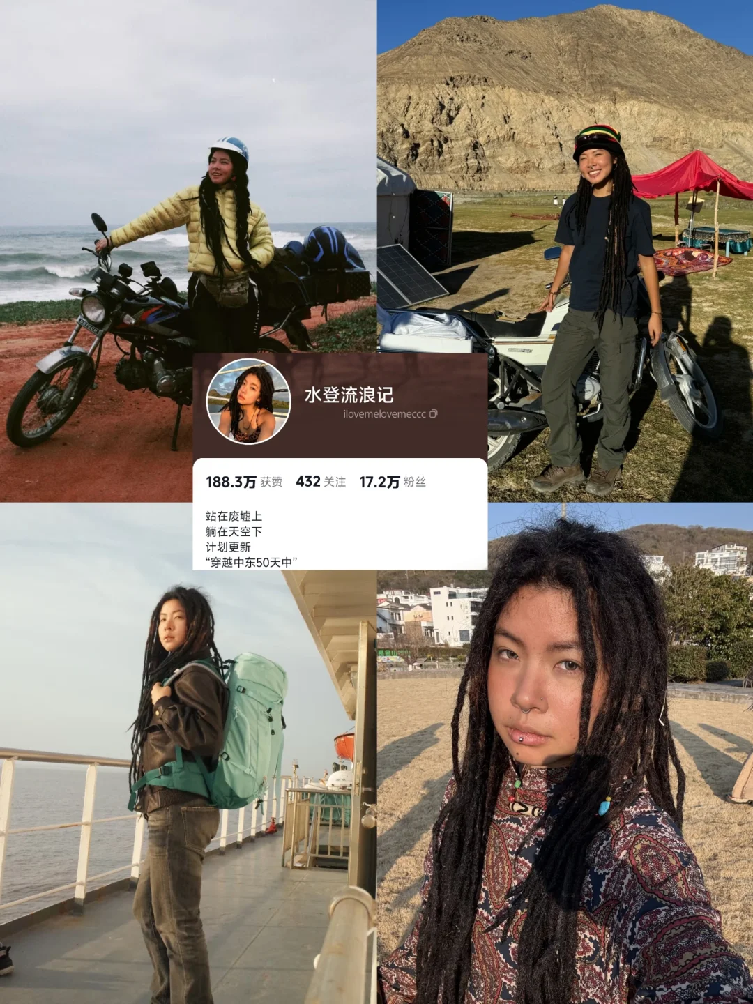 比如独自穿越中东的背包客「水登流浪记」,她喜欢冒险,喜欢记录古老文明,她只身前往写着“女性禁入”的景区,鼻钉、脏辫、健康肤色是她的标志。她证明,冒险从来不是只有男孩可以做到的事。