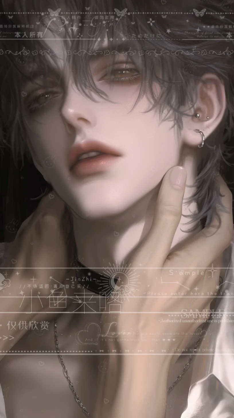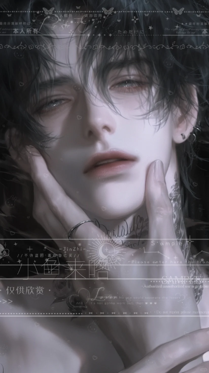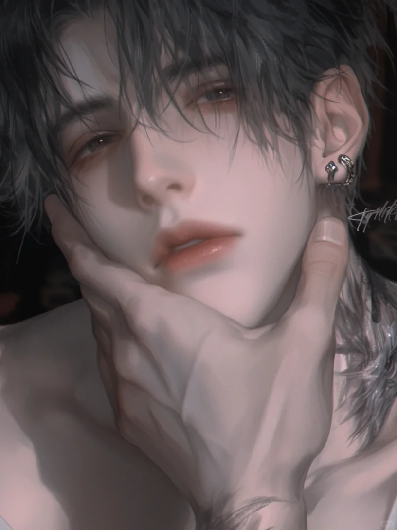 ② A photorealistic anime-style portrait of a man with black hair, pale skin, and silver eyes gently touching his face. He has a neck tattoo, creating a romantic vibe.