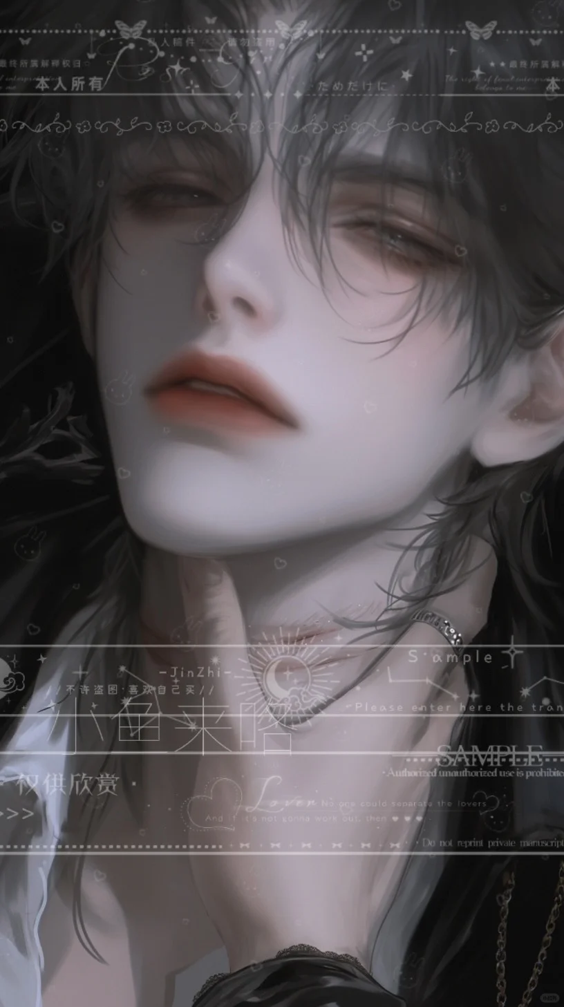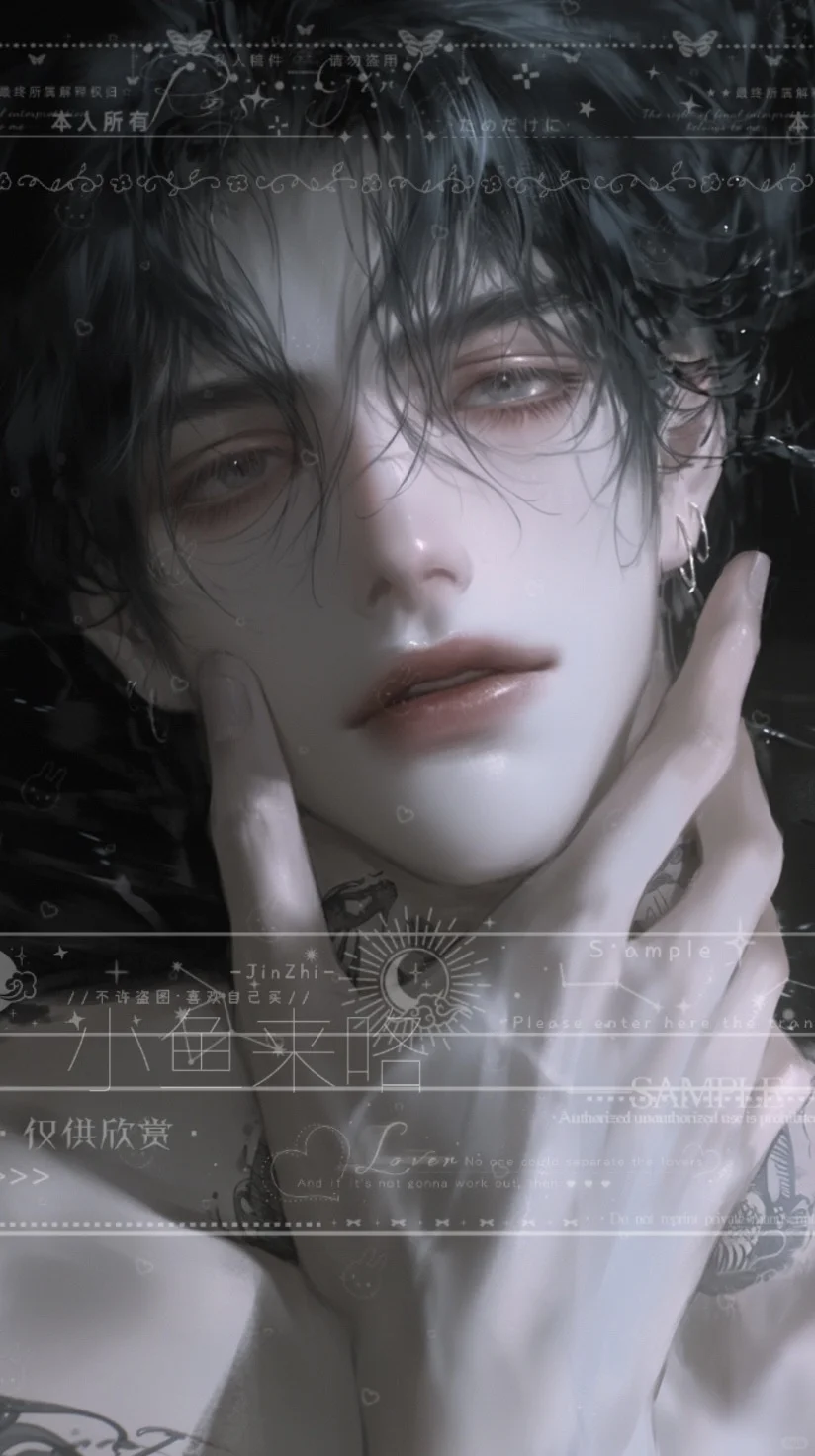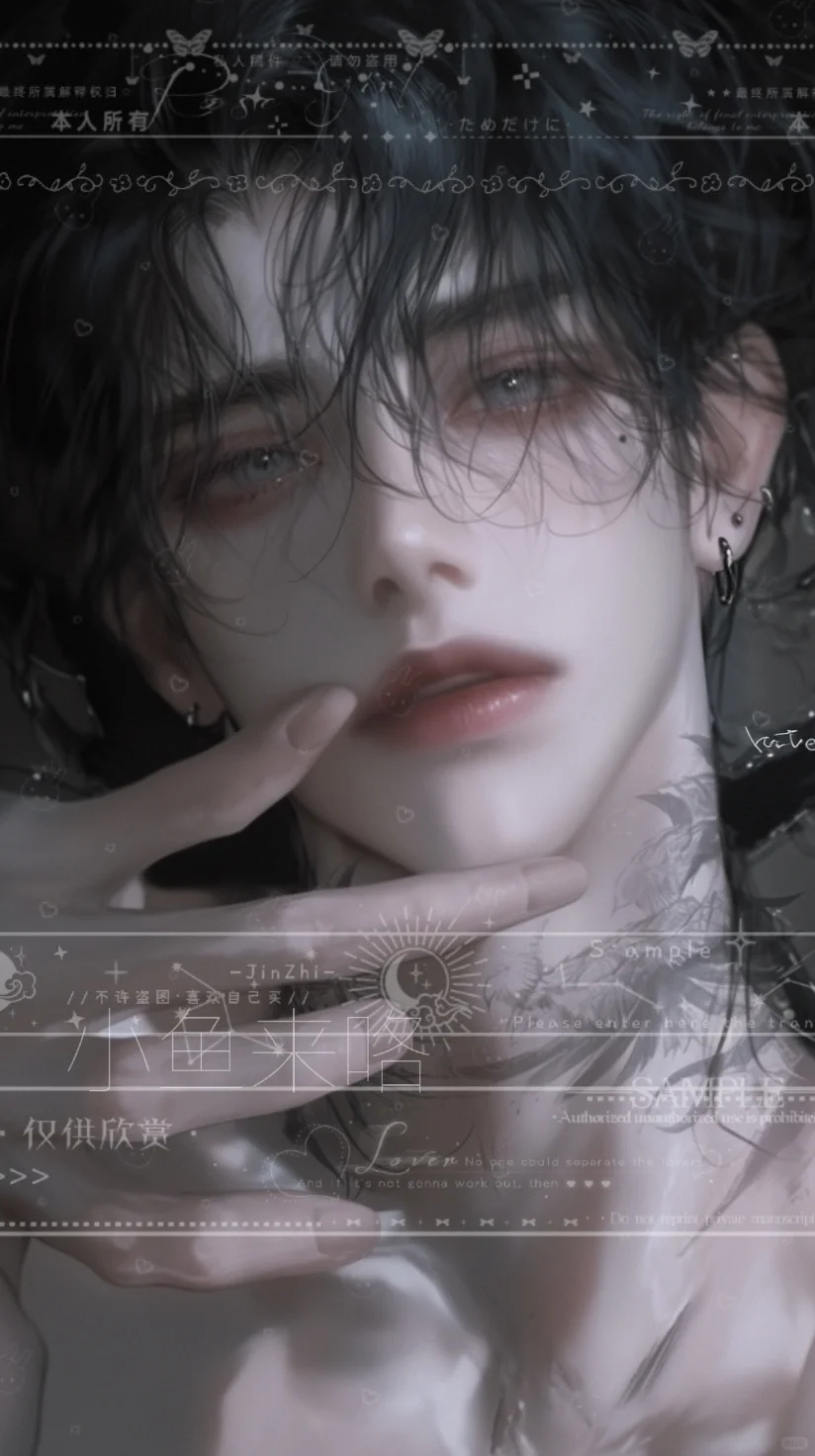 ② A photorealistic anime-style portrait of a man with black hair, pale skin, and silver eyes gently touching his face. He has a neck tattoo, creating a romantic vibe.