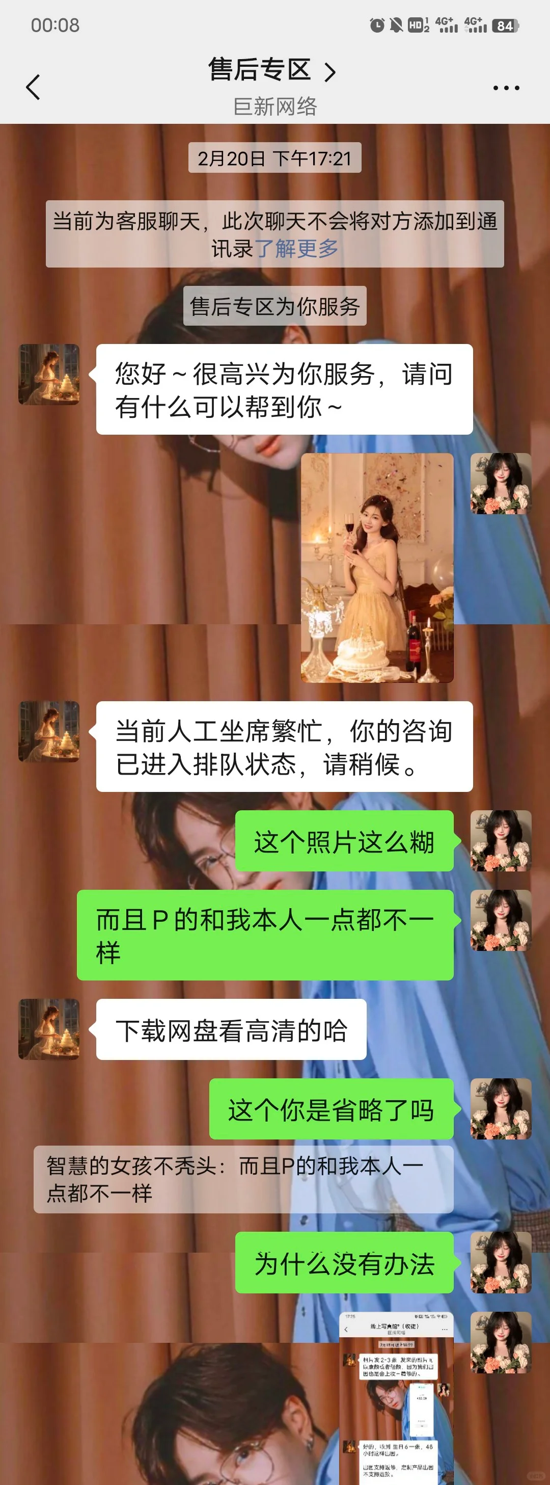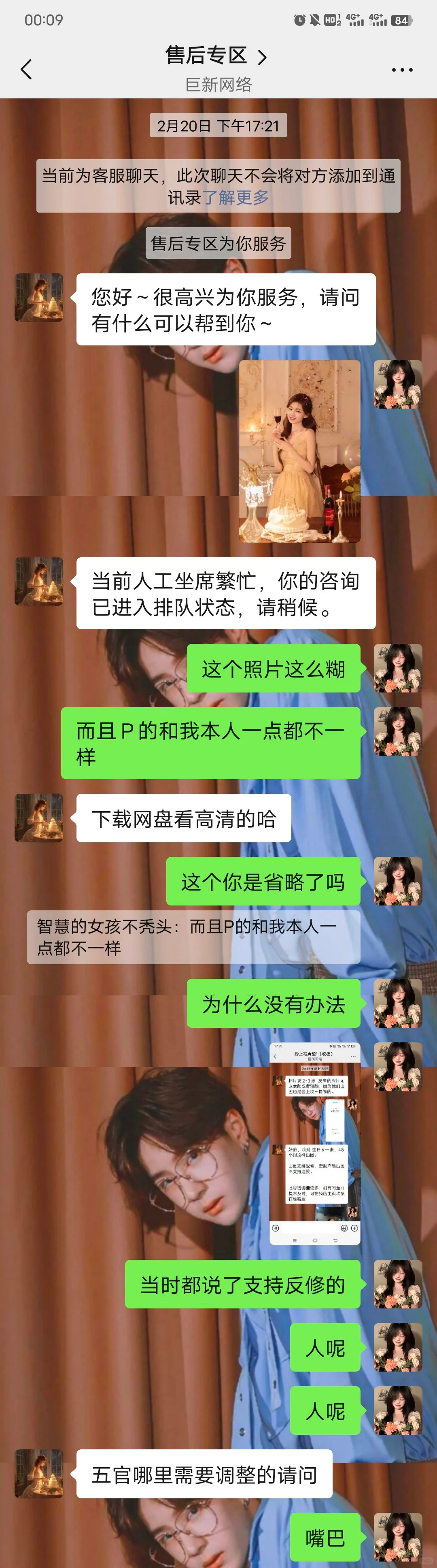 P1是第一次的成品,我感觉嘴巴很奇怪,而且也很糊,就去找客服,想着再修一下,结果客服发给我了一张高清的图片,但是说不能把露齿笑的嘴巴修成不露齿的微笑。这我就不服了,下单前店家清清楚楚的说不满意可以返修,于是我就跟客服交流(见P5.6.7),然后客服就说可以修了,但是我要再等96小时,我就跟客服说好的。刚刚我去看返修的图(P3),糊就不说了,这个嘴巴真的很奇怪,而且这个脸真的跟我本人一点关系都没有。
