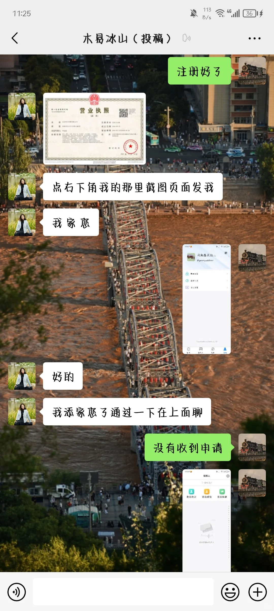 然后他就会说加我(图10),然后又引导我去加另外一个人,我当时没有截图,那就拿文字告诉大家:他首先让我加一个管理员,那个管理员说让我投什么类别的照片,投上去以后15分钟就能把稿费发到我(疑点:什么样的照片需要审15分钟?)我当时已经觉得不对劲了,然后就没有按照他说的做,去问了问他们的公司注册证明,结果他只给我发了一个营业执照(见图10第二条消息),然后不出意外的国家反诈 96110给我打电话了,当时我就认定他是骗子,无敌了,然后赶紧拉黑了他们所有联系方式