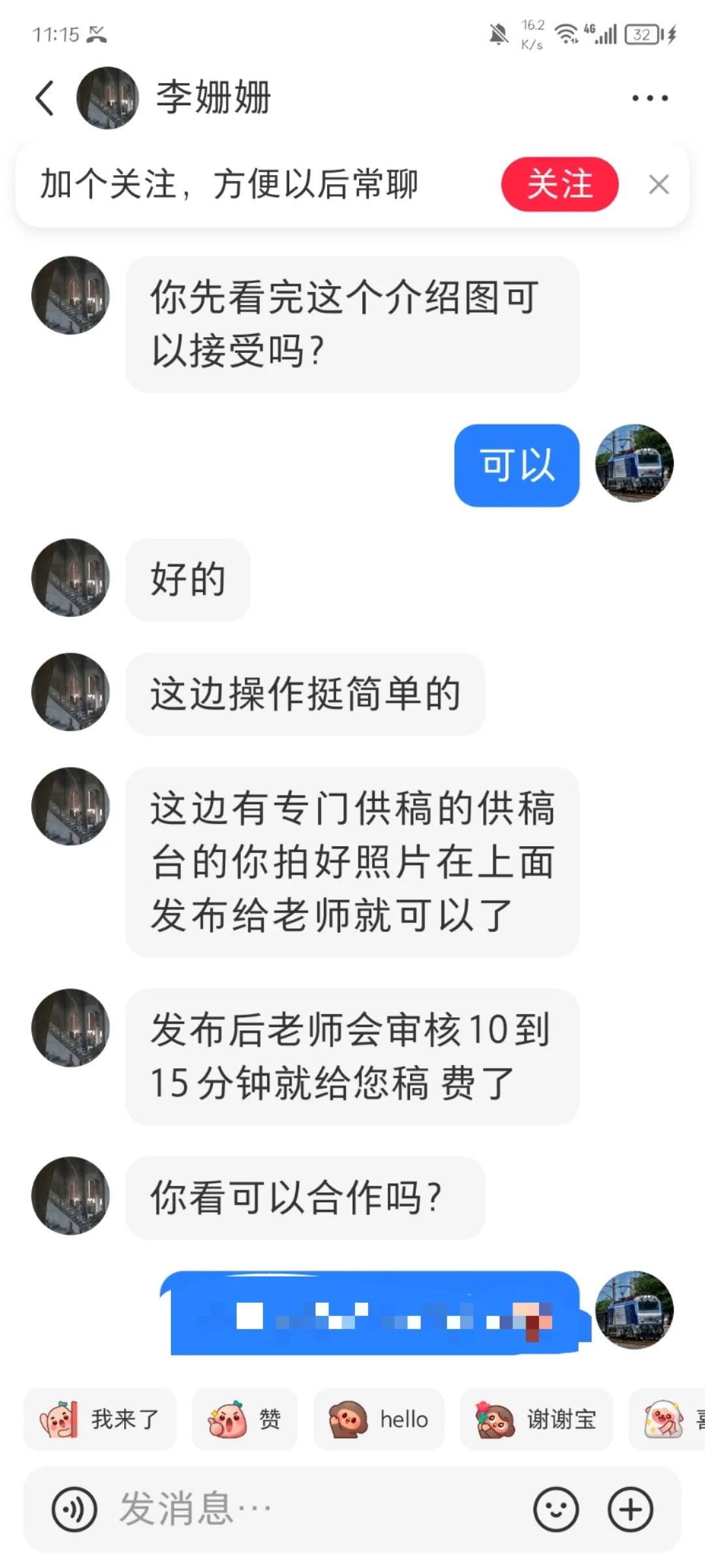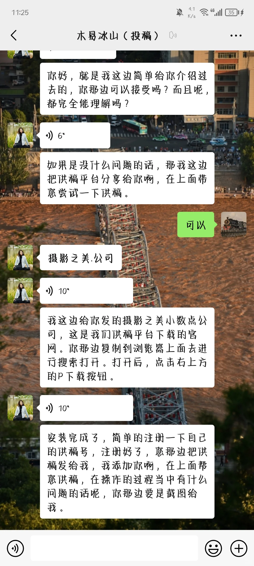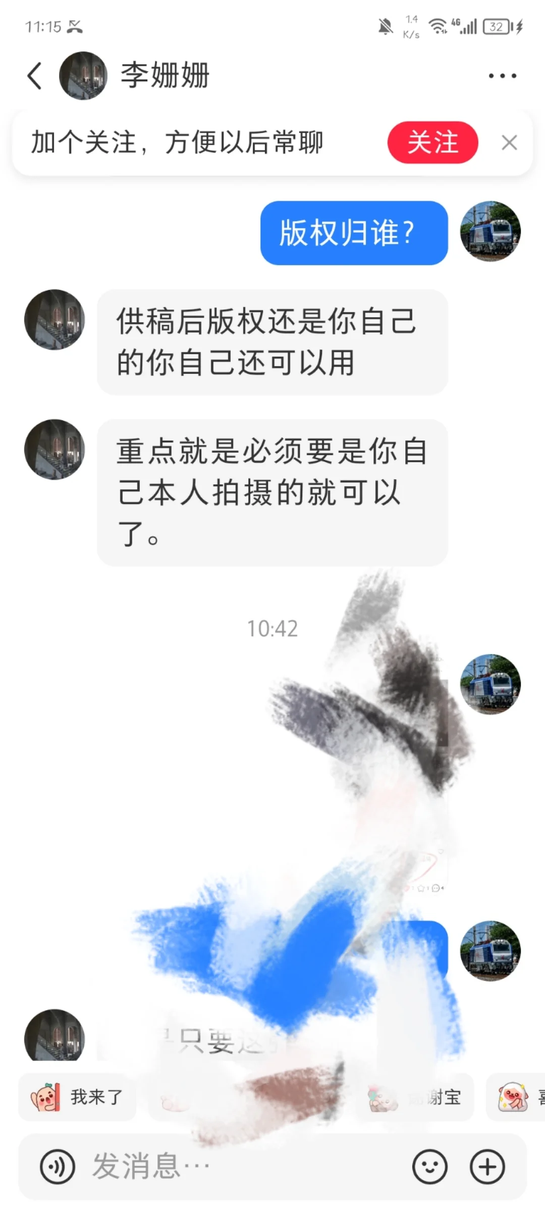正文:我发了一个图片,首先有个人找到我,说我拍的特别好,希望能投稿给他们(图1),然后有稿费10到2千块,看你拍的照片质量,因为我们这些业余摄影的人都不好赚钱,而且据他所说发布完版权还归我们(图2),所以很容易上当去跟他私信