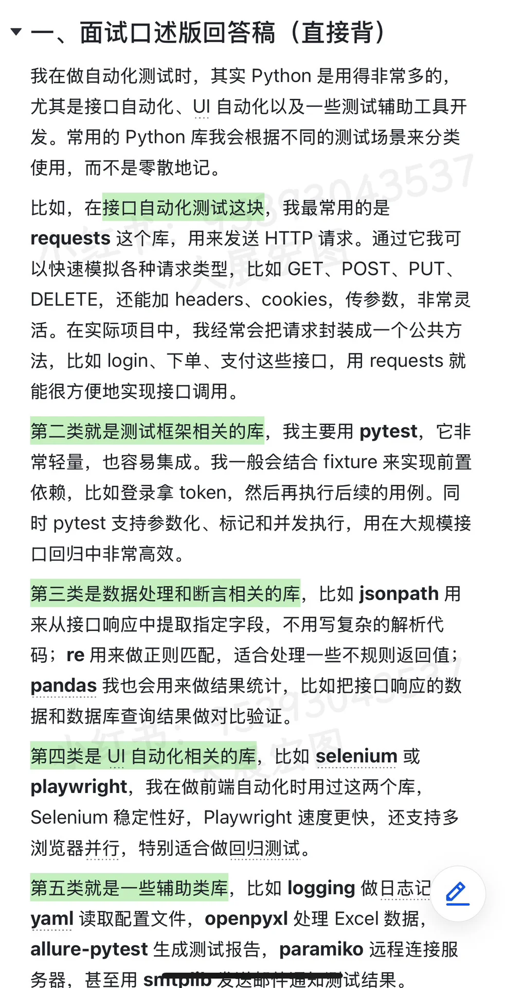 我在做自动化测试时,其实 Python 是用得非常多的,尤其是接口自动化、UI 自动化以及一些测试辅助工具开发。常用的 Python 库我会根据不同的测试场景来分类使用,而不是零散地记。
